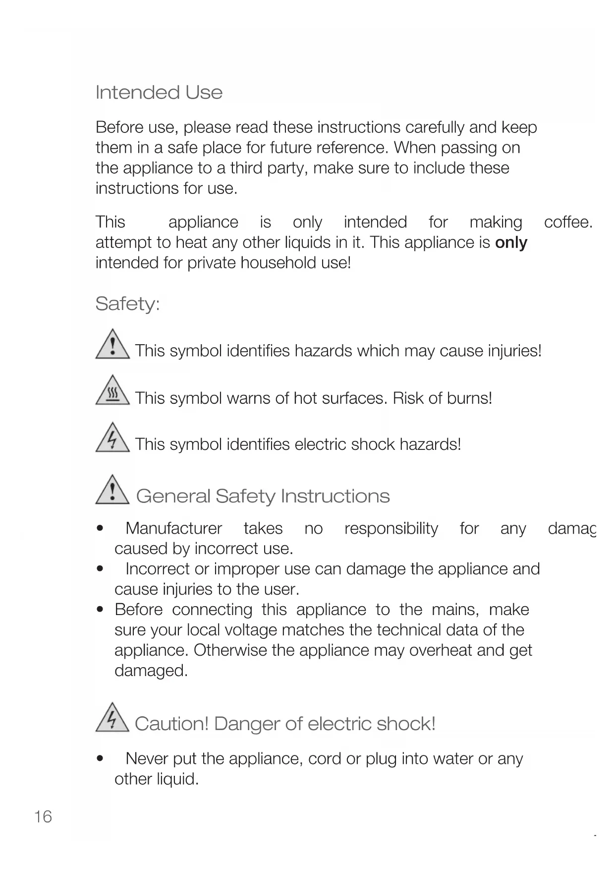 - Never open the filter cover or the filter holder respectively during operation, hot steam evaporates. Danger of serious burns!