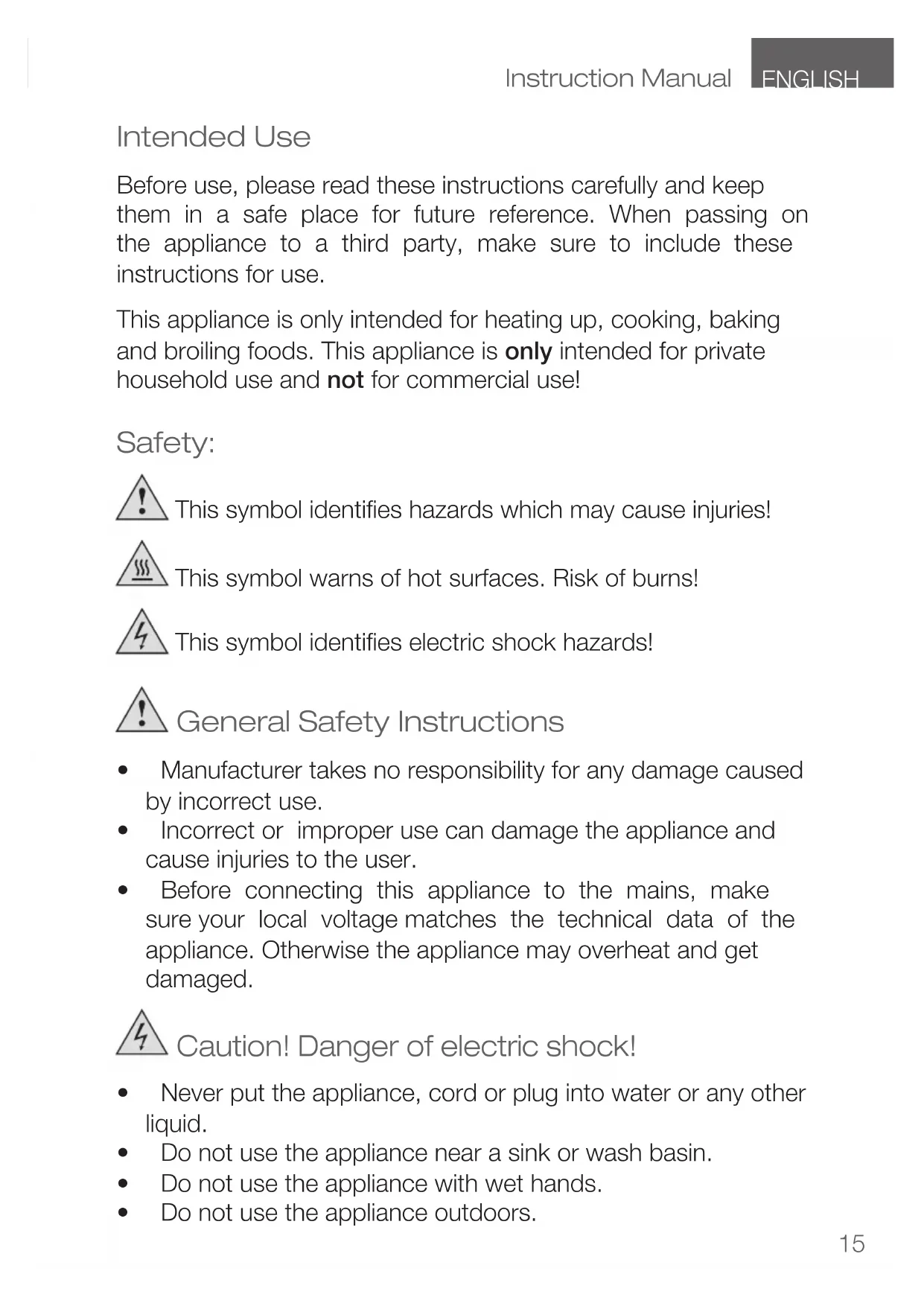 Intended Use Before use, please read these instructions carefully and keep them in a safe place for future reference. When passing on the appliance to a third party, make sure to include these instructions for use. This appliance is only intended for heating up, cooking, baking and broiling foods. This appliance is only intended for private household use and not for commercial use! Safety: This symbol identifies hazards which may cause injuries! This symbol warns of hot surfaces. Risk of burns! This symbol identifies electric shock hazards! General Safety Instructions