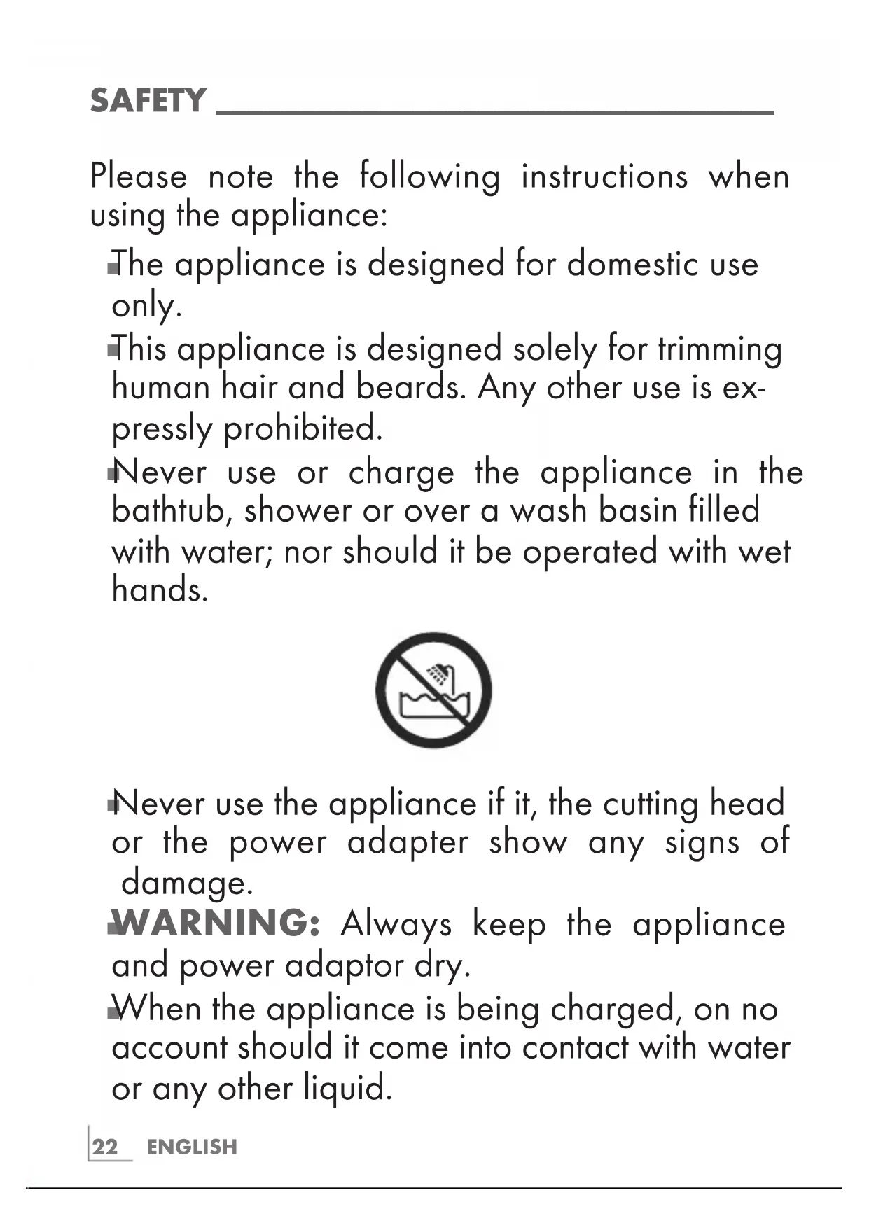 Never use or charge the appliance in the bathtub, shower or over a wash basin filled with water; nor should it be operated with wet hands.