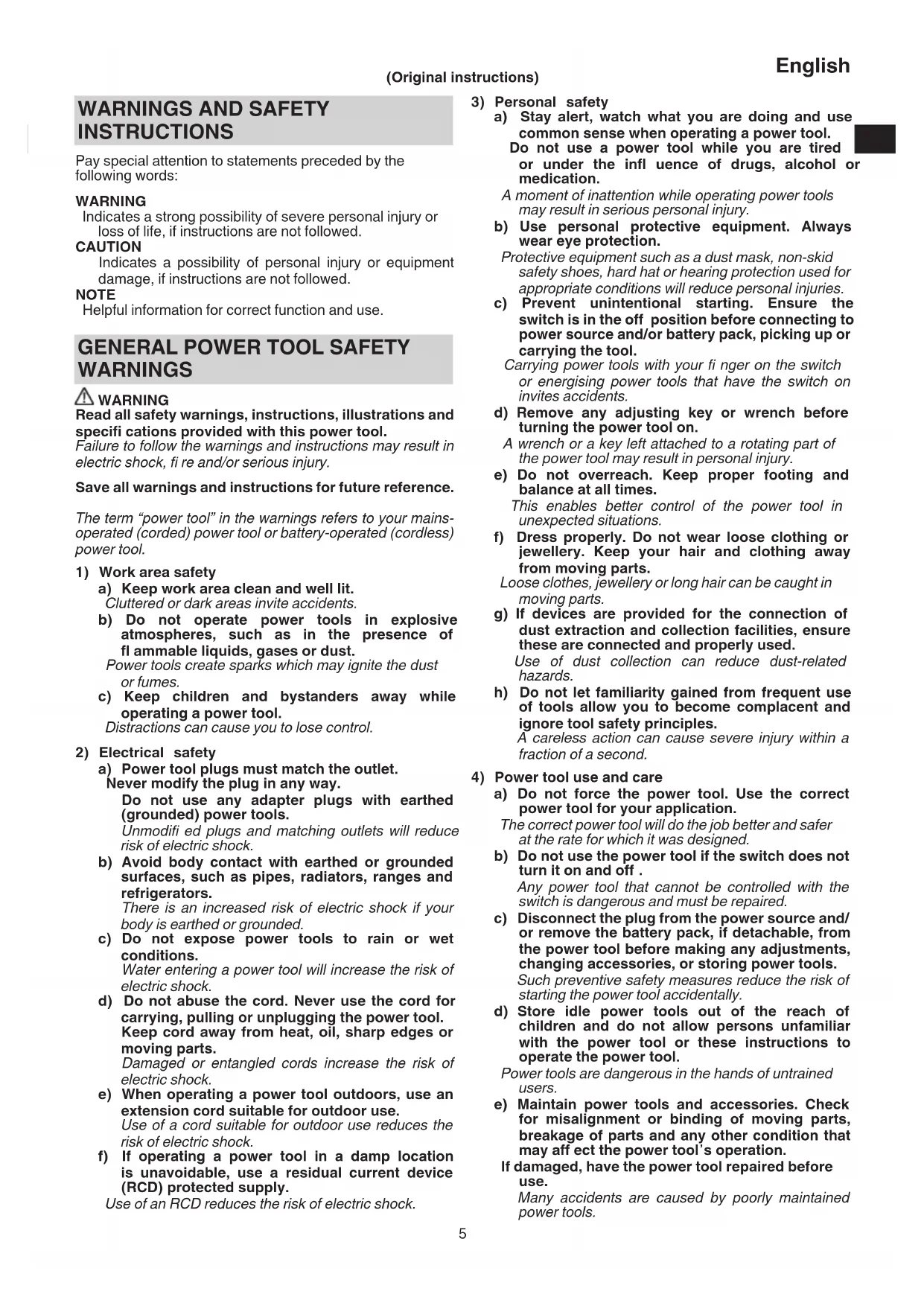 a) Power tool plugs must match the outlet. Never modify the plug in any way. Do not use any adapter plugs with earthed (grounded) power tools. Unmodifi ed plugs and matching outlets will reduce risk of electric shock. b) Avoid body contact with earthed or grounded surfaces, such as pipes, radiators, ranges and refrigerators. There is an increased risk of electric shock if your body is earthed or grounded. c) Do not expose power tools to rain or wet conditions. Water entering a power tool will increase the risk of electric shock. d) Do not abuse the cord. Never use the cord for carrying, pulling or unplugging the power tool. Keep cord away from heat, oil, sharp edges or moving parts. Damaged or entangled cords increase the risk of electric shock. e) When operating a power tool outdoors, use an extension cord suitable for outdoor use. Use of a cord suitable for outdoor use reduces the risk of electric shock. f) If operating a power tool in a damp location is unavoidable, use a residual current device (RCD) protected supply. Use of an RCD reduces the risk of electric shock. (Original instructions) 00BookCH3656DA.indb500BookCH3656DA.indb5 2024/02/289:56:332024/02/289:56:336 English f) Keep cutting tools sharp and clean. Properly maintained cutting tools with sharp cutting edges are less likely to bind and are easier to control. g) Use the power tool, accessories and tool bits etc. in accordance with these instructions, taking into account the working conditions and the work to be performed. Use of the power tool for operations diff erent from those intended could result in a hazardous situation. h) Keep handles and grasping surfaces dry, clean and free from oil and grease. Slippery handles and grasping surfaces do not allow for safe handling and control of the tool in unexpected situations.