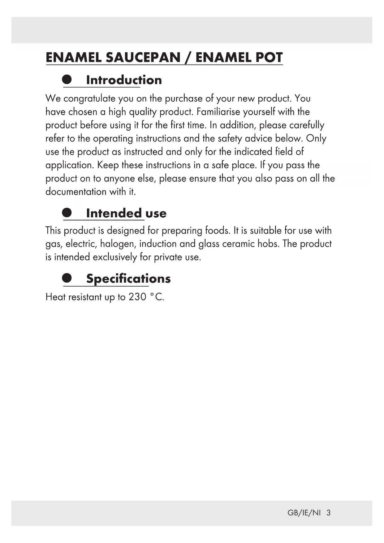 Introduction We congratulate you on the purchase of your new product. You have chosen a high quality product. Familiarise yourself with the product before using it for the first time. In addition, please carefully refer to the operating instructions and the safety advice below. Only use the product as instructed and only for the indicated field of application. Keep these instructions in a safe place. If you pass the product on to anyone else, please ensure that you also pass on all the documentation with it. Intended use This product is designed for preparing foods. It is suitable for use with gas, electric, halogen, induction and glass ceramic hobs. The product is intended exclusively for private use. Specifications Heat resistant up to 230 °C.4 GB/IE/NI Safety instructions SAVE ALL SAFETY INSTRUCTIONS AND INSTRUCTIONS FOR USE FOR FUTURE REFERENCE!