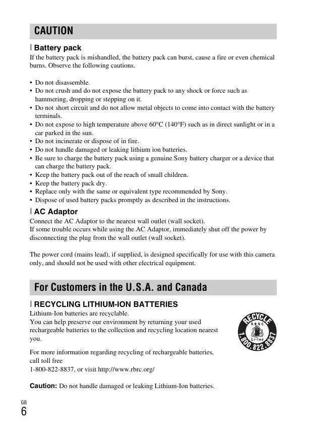 - Dispose of used battery packs promptly as described in the instructions. [ AC Adaptor Connect the AC Adaptor to the nearest wall outlet (wall socket). If some trouble occurs while using the AC Adaptor, immediately shut off the power by disconnecting the plug from the wall outlet (wall socket). The power cord (mains lead), if supplied, is designed specifically for use with this camera only, and should not be used with other electrical equipment. For Customers in the U.S.A. and Canada