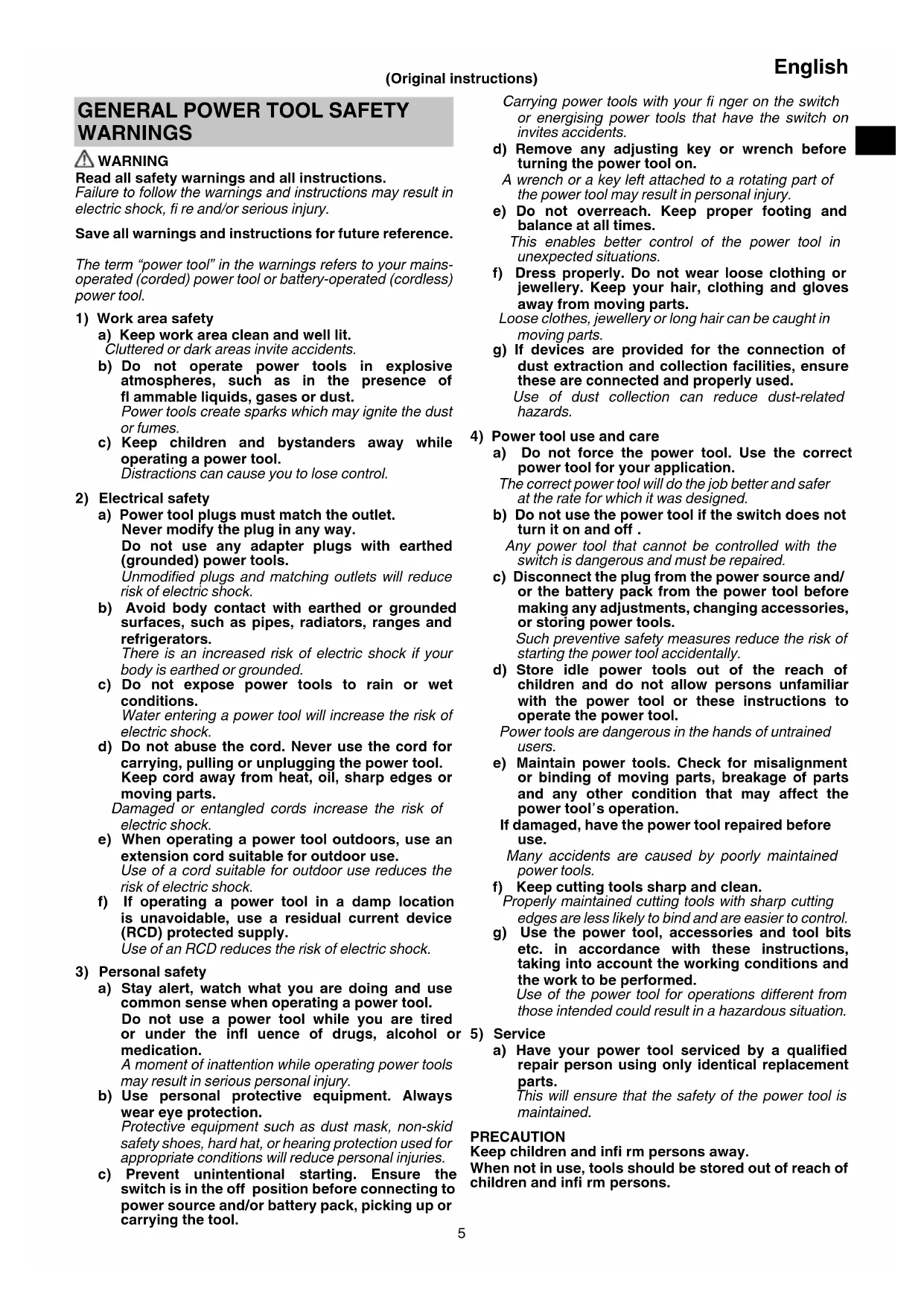 a) Have your power tool serviced by a qualifi ed repair person using only identical replacement parts. This will ensure that the safety of the power tool is maintained. PRECAUTION Keep children and infi rm persons away. When not in use, tools should be stored out of reach of children and infi rm persons.