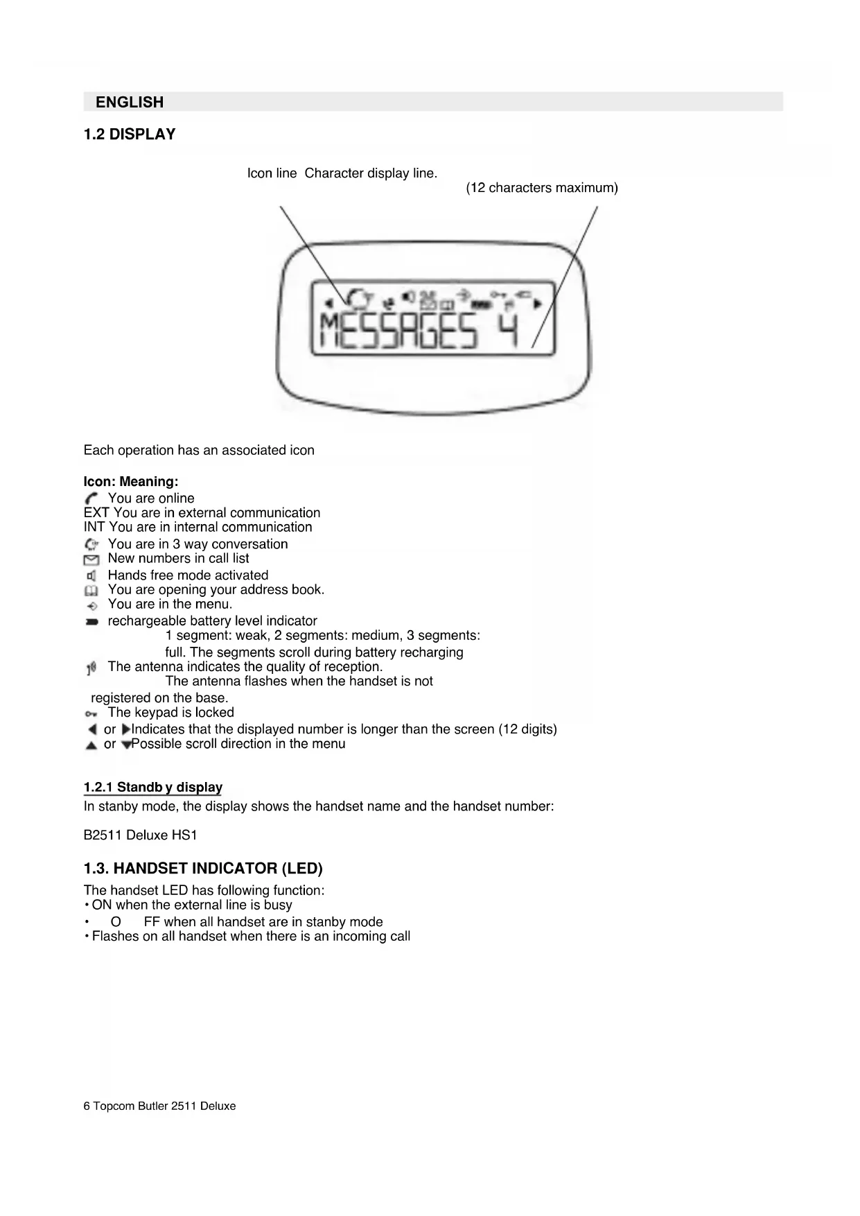 y display In stanby mode, the display shows the handset name and the handset number: B2511 Deluxe HS1 1.3. HANDSET INDICATOR (LED) The handset LED has following function: