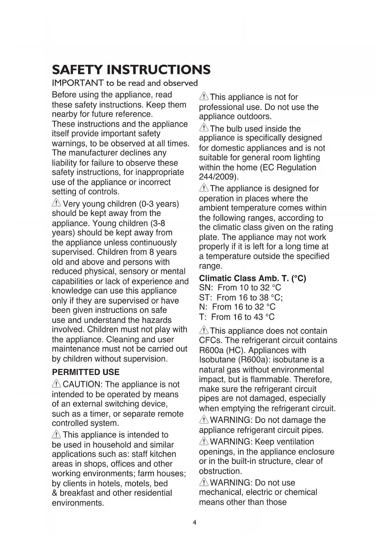SAFETY INSTRUCTIONS IMPORTANT to be read and observed Before using the appliance, read these safety instructions. Keep them nearby for future reference. These instructions and the appliance itself provide important safety warnings, to be observed at all times. The manufacturer declines any liability for failure to observe these safety instructions, for inappropriate use of the appliance or incorrect setting of controls. Very young children (0-3 years) should be kept away from the appliance. Young children (3-8 years) should be kept away from the appliance unless continuously supervised. Children from 8 years old and above and persons with reduced physical, sensory or mental capabilities or lack of experience and knowledge can use this appliance only if they are supervised or have been given instructions on safe use and understand the hazards involved. Children must not play with the appliance. Cleaning and user maintenance must not be carried out by children without supervision. PERMITTED USE CAUTION: The appliance is not intended to be operated by means of an external switching device, such as a timer, or separate remote controlled system. This appliance is intended to be used in household and similar applications such as: staff kitchen areas in shops, ofces and other working environments; farm houses; by clients in hotels, motels, bed & breakfast and other residential environments. This appliance is not for professional use. Do not use the appliance outdoors. The bulb used inside the appliance is specically designed for domestic appliances and is not suitable for general room lighting within the home (EC Regulation 244/2009). The appliance is designed for operation in places where the ambient temperature comes within the following ranges, according to the climatic class given on the rating plate. The appliance may not work properly if it is left for a long time at a temperature outside the specied range. Climatic Class Amb. T. (°C) SN: From 10 to 32 °C ST: From 16 to 38 °C; N: From 16 to 32 °C T: From 16 to 43 °C This appliance does not contain CFCs. The refrigerant circuit contains R600a (HC). Appliances with Isobutane (R600a): isobutane is a natural gas without environmental impact, but is ammable. Therefore, make sure the refrigerant circuit pipes are not damaged, especially when emptying the refrigerant circuit.
