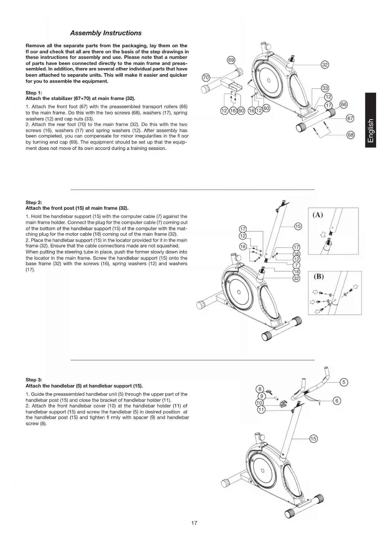 screws (16), washers (17) and spring washers (12). After assembly has been completed, you can compensate for minor irregularities in the fl oor by turning end cap (69). The equipment should be set up that the equip- ment does not move of its own accord during a training session. Step 2: Attach the front post (15) at main frame (32).