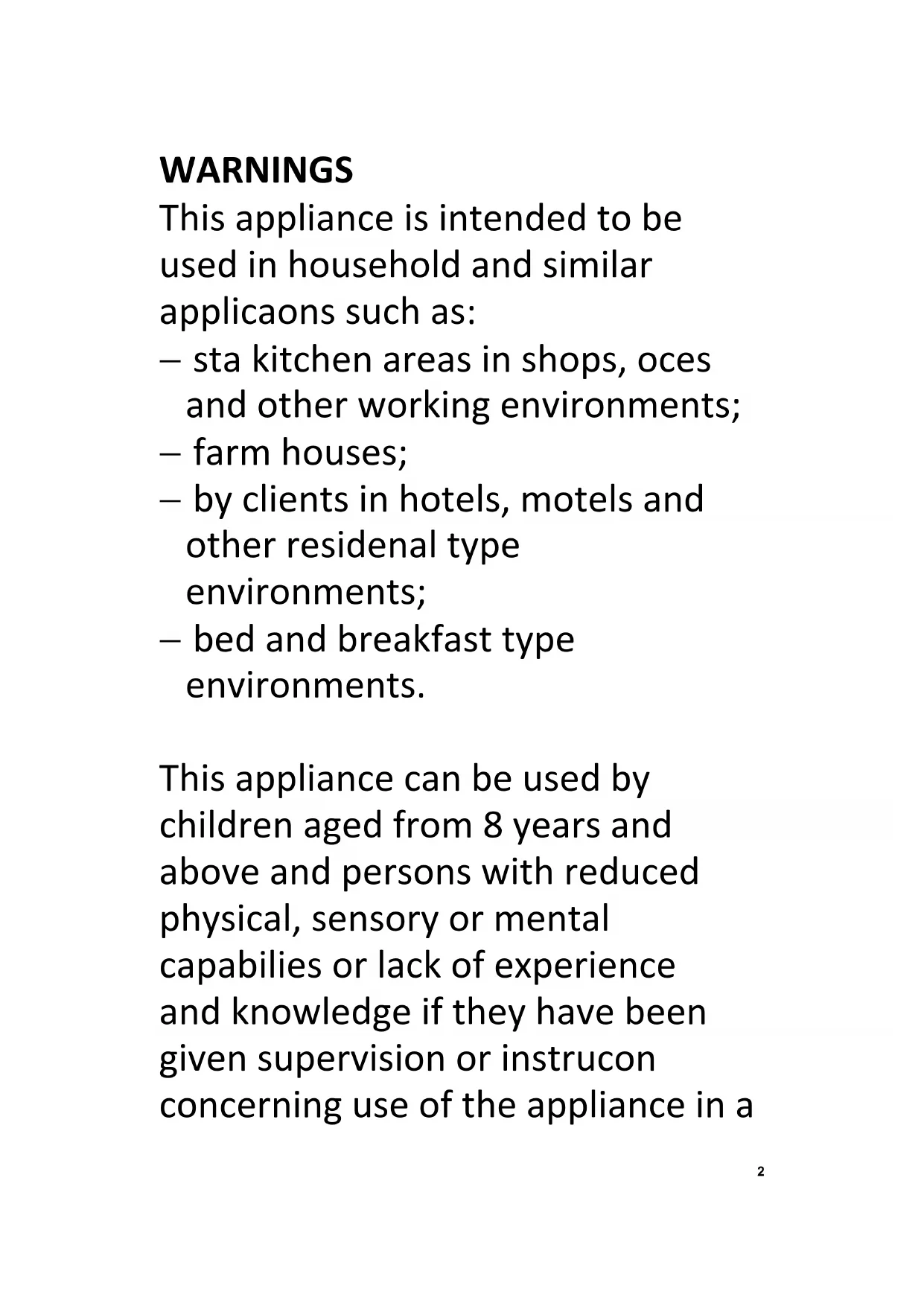 GB2 WARNINGS This appliance is intended to be used in household and similar applications such as: staff kitchen areas in shops, offices and other working environments; farm houses; by clients in hotels, motels and other residential type environments; bed and breakfast type environments. This appliance can be used by children aged from 8 years and above and persons with reduced physical, sensory or mental capabilities or lack of experience and knowledge if they have been given supervision or instruction concerning use of the appliance in a3 safe way and understand the hazards involved. Children shall not play with the appliance. Cleaning and user maintenance shall not be made by children without supervision. If the supply cord is damaged, it must be replaced by the manufacturer, its service agent or similarly qualified persons in order to avoid a hazard. For the details concerning the method and frequency of cleaning, please see section “Cleaning and maintenance” on pages 19&20. The door should not be left in the open position since this could present a tripping hazard.4