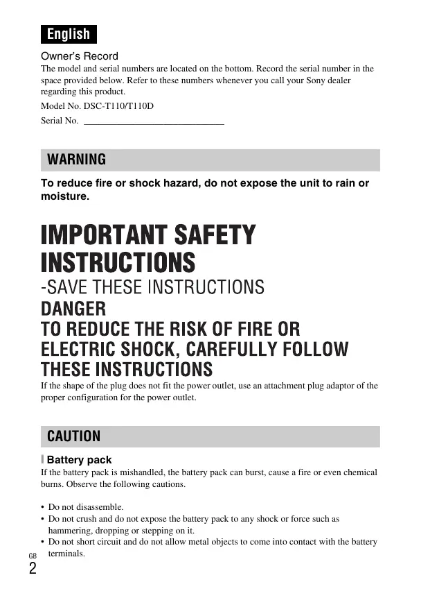 Printed in China © 2011 Sony Corporation English Owner’s Record The model and serial numbers are located on the bottom. Record the serial number in the space provided below. Refer to these numbers whenever you call your Sony dealer regarding this product. Model No. DSC-T110/T110D Serial No. ______________________________ WARNING To reduce fire or shock hazard, do not expose the unit to rain or moisture. If the shape of the plug does not fit the power outlet, use an attachment plug adaptor of the proper configuration for the power outlet. CAUTION [ Battery pack If the battery pack is mishandled, the battery pack can burst, cause a fire or even chemical burns. Observe the following cautions.