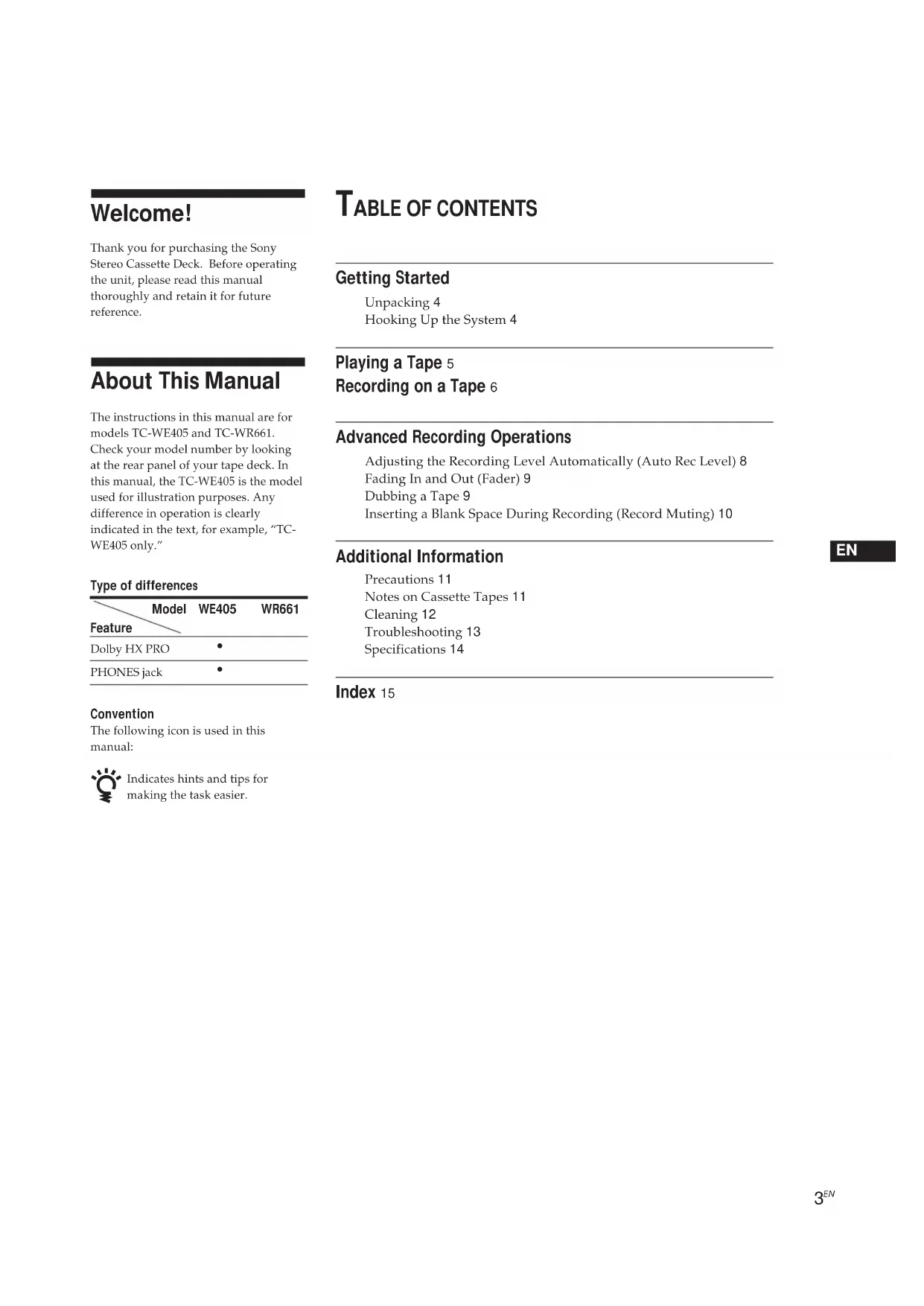 Getting Started Unpacking 4Hooking Up the System 4 Playing a Tape 5 Recording on a Tape 6 Advanced Recording Operations Adjusting the Recording Level Automatically (Auto Rec Level) 8Fading In and Out (Fader) 9Dubbing a Tape 9Inserting a Blank Space During Recording (Record Muting) 10 Additional Information Precautions 11Notes on Cassette Tapes 11Cleaning 12Troubleshooting 13Specifications 14 Index 15 Welcome! Thank you for purchasing the SonyStereo Cassette Deck. Before operatingthe unit, please read this manualthoroughly and retain it for futurereference. About This Manual The instructions in this manual are formodels TC-WE405 and TC-WR661.Check your model number by lookingat the rear panel of your tape deck. Inthis manual, the TC-WE405 is the modelused for illustration purposes. Anydifference in operation is clearlyindicated in the text, for example, “TC-WE405 only.”Type of differencesModelFeatureDolby HX PROPHONES jackConventionThe following icon is used in thismanual: Indicates hints and tips formaking the task easier.WE405