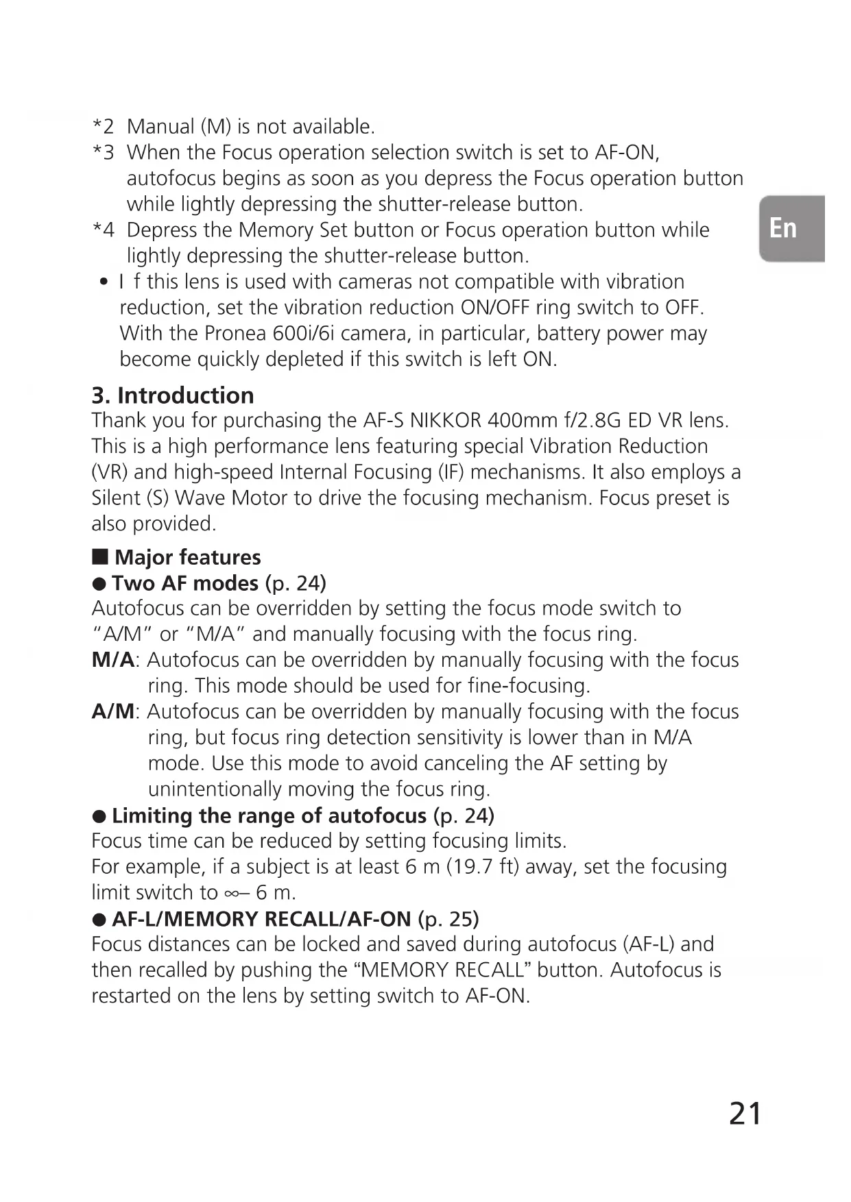 Thank you for purchasing the AF-S NIKKOR 400mm f/2.8G ED VR lens. This is a high performance lens featuring special Vibration Reduction (VR) and high-speed Internal Focusing (IF) mechanisms. It also employs a Silent (S) Wave Motor to drive the focusing mechanism. Focus preset is also provided. Major features Two AF modes (p. 24) Autofocus can be overridden by setting the focus mode switch to “A/M” or “M/A” and manually focusing with the focus ring. M/A: Autofocus can be overridden by manually focusing with the focus ring. This mode should be used for fine-focusing. A/M: Autofocus can be overridden by manually focusing with the focus ring, but focus ring detection sensitivity is lower than in M/A mode. Use this mode to avoid canceling the AF setting by unintentionally moving the focus ring. Limiting the range of autofocus (p. 24) Focus time can be reduced by setting focusing limits. For example, if a subject is at least 6 m (19.7 ft) away, set the focusing limit switch to ∞ – 6 m. AF-L/MEMORY RECALL/AF-ON (p. 25) Focus distances can be locked and saved during autofocus (AF-L) and then recalled by pushing the “MEMORY RECALL” button. Autofocus is restarted on the lens by setting switch to AF-ON.22