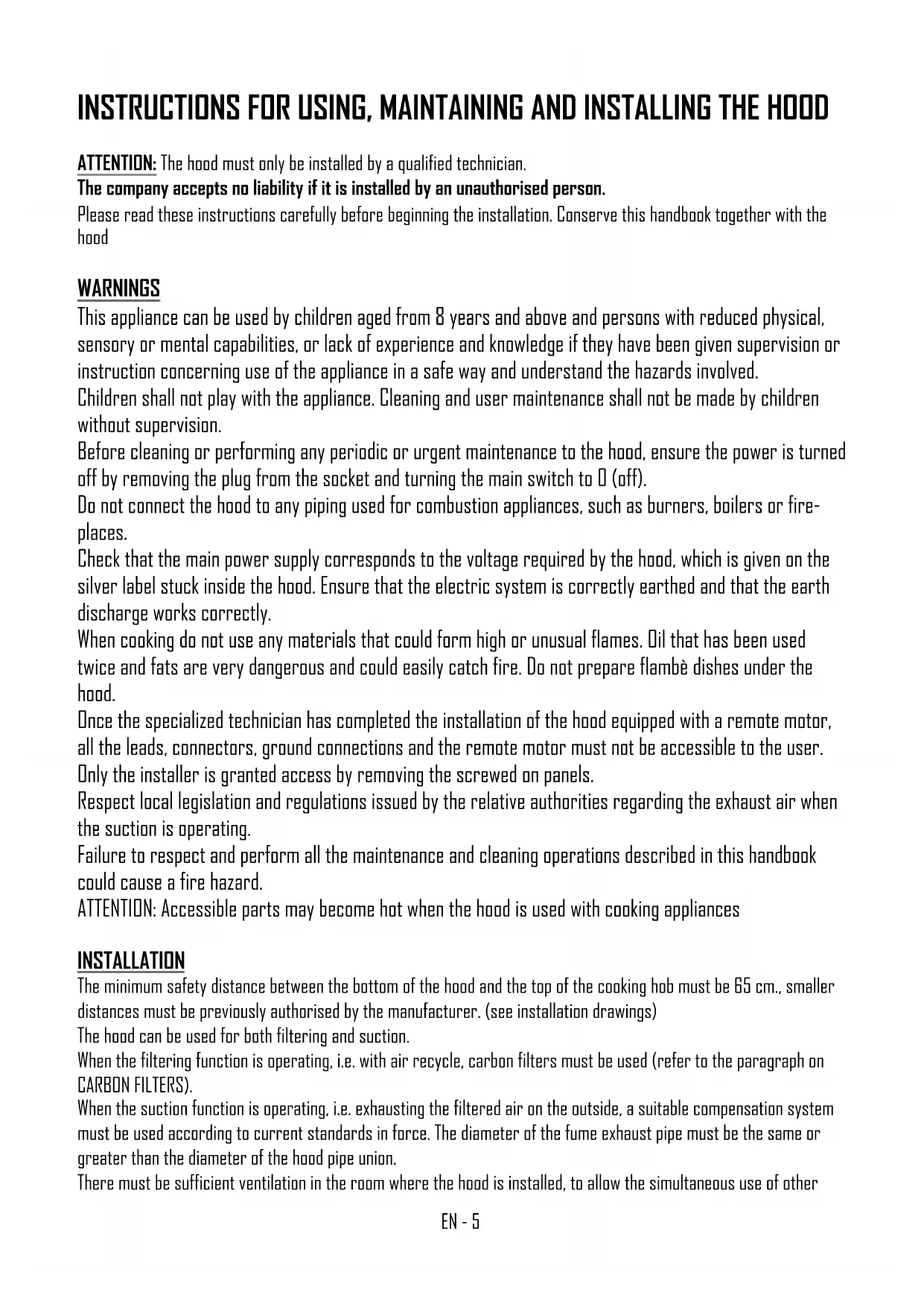 Before beginning any sort of cleaning or maintenance work, turn power off to the hood by turning the main switch to 0 (OFF). Changing the light bulbs 12V halogen G4 attachment: Use a screwdriver to unscrew the glass support ring (Fig. 5). Remove the glass and chan- ge the light bulb with another identical. Replace the protective glass and screw back the ring. The light bulbs can be purchased in any electrical supply shop. Dichroic lamp G4 attachment: Use a screwdriver to remove and change the dichroic lamp with another identical (Fig. 6). LED spotlight replacement should only be carried out by qualified technicians using only original spare parts. Cleaning the metal filters: The metal filters fitted in the hood should be washed every 2-3 months, depending on how much the hood is used, using hot water and a liquid detergent that is not too aggressive. The metal filters can be removed by the special handle, unhooking the front part of the filter and pulling it downwards (Fig. 7) Carbon filters If the hood is used with an internal recycle filtering system, then active carbon filters must be used. The active carbon in the filters traps the cooking smells. To remove and change the filters, refer to fig. 8. POLYESTER carbon filters cannot be reused or washed and must be periodically changed (every 4 months if the hood is used for 2 hours every day). Saturate filters could be a fire hazard. Depending on the hood model, the carbon filters are round or rectangular. LONG LIFE carbon filter can be cleaned and reactivated. The filter should be cleaned every other month if used nor- mally. The filter is best cleaned in a dishwasher at the highest temperature using normal washer detergent. The filter should be washed on its own to prevent particles of food from fastening in it and then causing an unpleasant smell later on. To reactivate the carbon the filter should be dried in the oven. Chose upper/ lower heat and maximum 100 ° C and try the filter for 10 minutes. The filter must be changed when it no longer absorbs the cooking smells suffi- ciently. (fig.9) Cleaning the hood The surfaces of the hood should be cleaned frequently, to avoid the risk of having to remove built up and encrusted deposits and stains. For the painted or copper plated hoods just use a soft cloth with warm water and a neutral de- tergent. Do not pour the detergent directly onto the hood or use powdery or abrasive products. For the stainless steel hood, use special products and cloths for satin finish stainless steel (not abrasive, corrosive detergents or detergents containing chloride), ensuring to clean in the same direction as the satin finish. Do not use aggressive products, chemical solvents or derivatives of oil distillates that could leave oily traces which could cause oxidation and polymerisation. Condensation in the hood Induction or glass ceramic hobs heat food up very quickly, creating cooking steam before the glass or steel surface of the hood has heated up, which causes condensation on the hood that then drips. Another cause for condensation could be that the fume pipe is not the size we recommend (see INSTALLATION). The steam that remains inside the hood while it is cooling down condensates and drips. Therefore it is advisable to turn the hood on ten minutes before starting to cook and when you have finished, leave it on so that all the fumes in the pipe are expelled. Furthermore, it is important to clean the filters frequently and if they are worn they should be replaced (see CLEAN- ING THE METAL FILTERS). The manufacturer accepts no responsibility for damage to the surface of the hood due to failure to respect these instructions.DE - 9