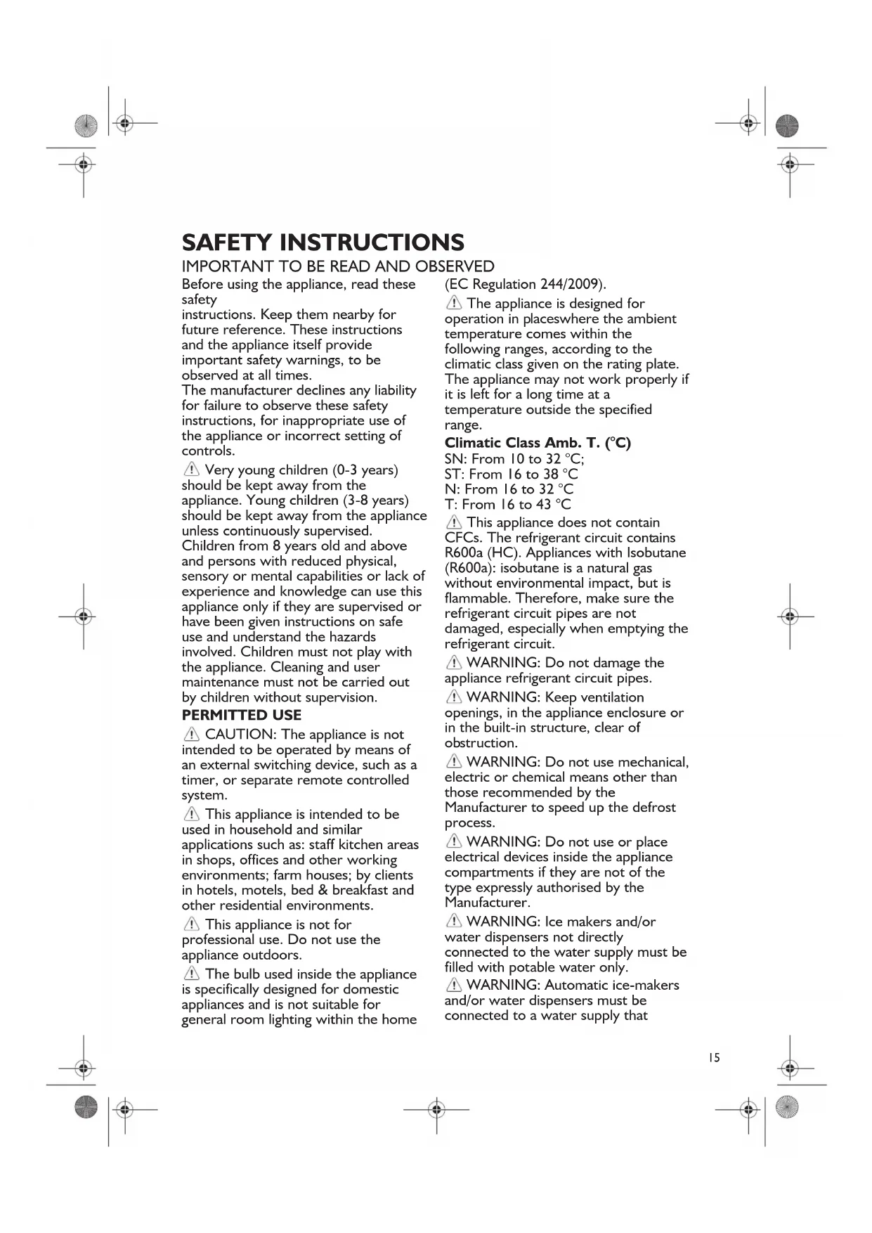Before using the appliance, read these safety instructions. Keep them nearby for future reference. These instructions and the appliance itself provide important safety warnings, to be observed at all times. The manufacturer declines any liability for failure to observe these safety instructions, for inappropriate use of the appliance or incorrect setting of controls. Very young children (0-3 years) should be kept away from the appliance. Young children (3-8 years) should be kept away from the appliance unless continuously supervised. Children from 8 years old and above and persons with reduced physical, sensory or mental capabilities or lack of experience and knowledge can use this appliance only if they are supervised or have been given instructions on safe use and understand the hazards involved. Children must not play with the appliance. Cleaning and user maintenance must not be carried out by children without supervision. PERMITTED USE CAUTION: The appliance is not intended to be operated by means of an external switching device, such as a timer, or separate remote controlled system. This appliance is intended to be used in household and similar applications such as: staff kitchen areas in shops, offices and other working environments; farm houses; by clients in hotels, motels, bed & breakfast and other residential environments. This appliance is not for professional use. Do not use the appliance outdoors. The bulb used inside the appliance is specifically designed for domestic appliances and is not suitable for general room lighting within the home (EC Regulation 244/2009). The appliance is designed for operation in p laceswhere the ambient temperature comes within the following ranges, according to the climatic class given on the rating plate. The appliance may not work properly if it is left for a long time at a temperature outside the specified range. Climatic Class Amb. T. (°C) SN: From 10 to 32 °C; ST: From 16 to 38 °C N: From 16 to 32 °C T: From 16 to 43 °C This appliance does not contain CFCs. The refrigerant circuit cont ains R600a (HC). Appliances with Isobutane (R600a): isobutane is a natural gas without environmental impact, but is flammable. Therefore, make sure the refrigerant circuit pipes are not damaged, especially when emptying the refrigerant circuit.
