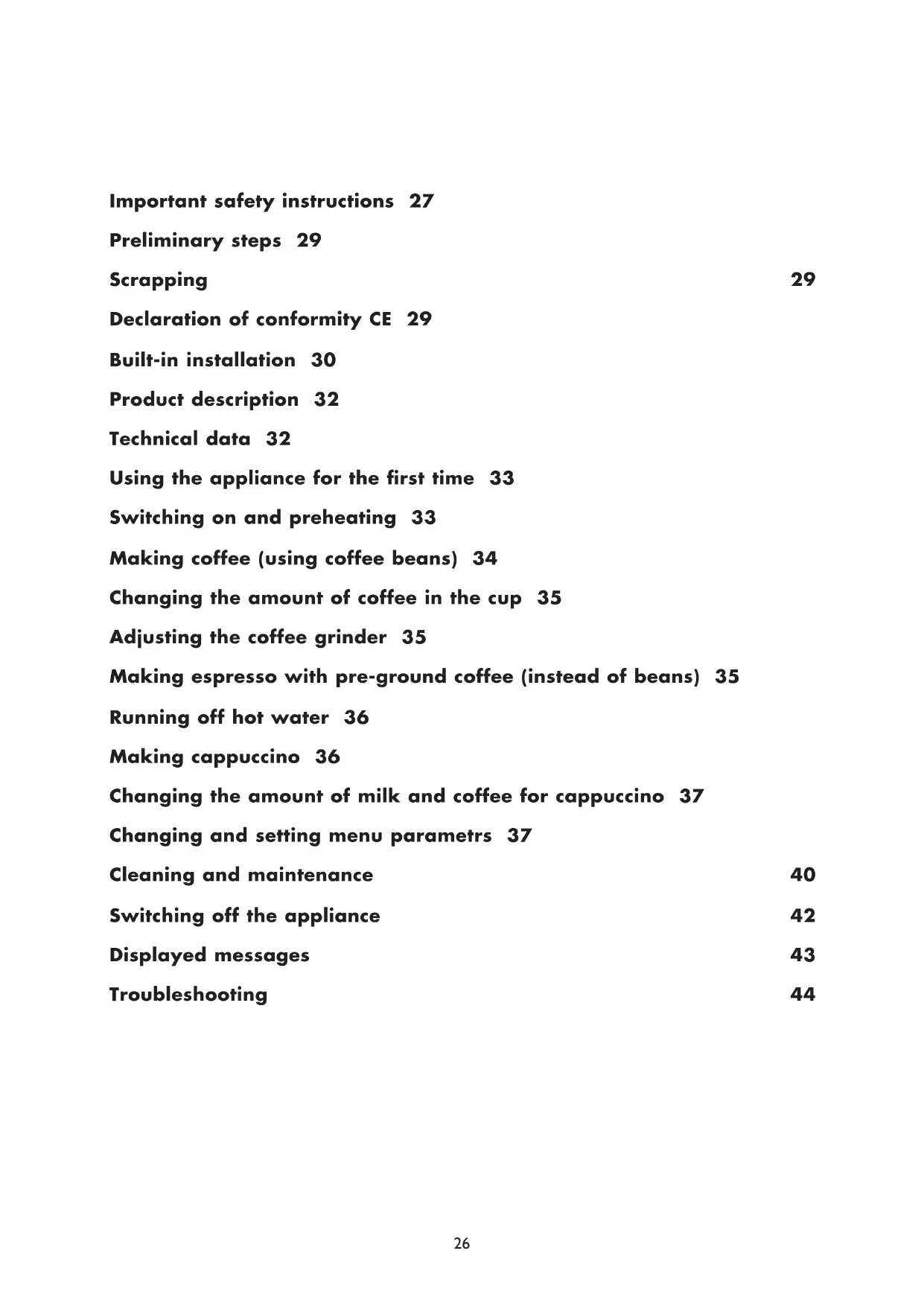The coffee is not hot. - The cups have not been pre-heated. - The brewing unit has cooled down because 2/3 minutes have elapsed since the last coffee was made. - The set temperature is not high enough. - Heat the cups by rinsing them with hot water. - Before making coffee, heat the brewing unit by selecting the RINSE function from the menu. - Change the set temperature (see paragraph Changing the coffee temperature). The coffee is not creamy enough. - The coffee is ground too coarsely. - The blend of coffee is unsuitable. - Turn the grinding adjustment knob one click anti- clockwise towards the number 1 while the coffee mill is in operation (Figure 14). - Use a blend of coffee specifically for espresso coffee machines. The coffee runs out too slowly or in drips. - The coffee is ground too finely. - Turn the grinding adjustment knob one click clockwise towards the number 7 while the coffee mill is in operation (Figure 14). Continue one click at a time until coffee run-off is satisfactory. Results are only visible after running off 2 coffees. The coffee runs out too quickly. - The coffee is ground too coarsely. - Turn the grinding adjustment knob one click anti- clockwise towards the number 1 while the coffee mill is in operation (Figure 14). Avoid turning the grinding coarseness regulator too far otherwise when you select 2 cups, the coffee may run out in drips. Results are only visible after running off 2 coffees. The coffee does not run out of one or either of the spouts. - The spouts are blocked. - Clean the spouts with a toothpick (Figure 26). The coffee does not come out of the spouts, but around the service door (A2). - The holes in the spouts are clogged with dry coffee powder. - The coffee feed (A3) inside the service door is blocked. - Clean the spouts with a toothpick, a sponge or a hard bristled kitchen brush (Figures 26-28). - Clean the coffee feed (A3) thoroughly, especially around the hinges. Water comes out of the spouts instead of coffee. - Ground coffee is blocking the funnel (A21) - Clean the funnel (A21) with a wooden or plastic fork and clean the inside of the machine. The milk does not come out of the milk spout (C5). - The intake tube is not inserted or is inserted incorrectly. - Insert the intake tube (C4) in the rubber washer in the milk container lid (Figure 23). The milk is not well frothed. - The milk container lid is dirty. - The milk pointer is incorrectly positioned. - Clean the milk container lid as described in paragraph Cleaning the milk container. - Adjust the pointer as described in chapter MAKING CAPPUCCINO. The milk contains large bubbles or spurts out of the milk spout - The milk is not cold enough or is not semi-skimmed. - The milk frother pointer is incorrectly adjusted. - The milk container lid is dirty. - Ideally, use skimmed milk at refrigerator temperature, or semi-skimmed milk at refrigerator temperature (about 5°C). If results are still not satisfactory, try changing brand of milk. - Move the pointer slightly towards the word CAFFELATTE (see chapter MAKING CAPPUCCINO). - Clean the milk container lid as described in paragraph Cleaning the milk container.Instructions importantes sur la sécurité 46 Opérations préliminaires 48 Mise au rebut 48 Déclaration de conformité CE 48 Installation dans un meuble 49 Description de l’appareil 51 Données techniques 51 Première mise en service de l’appareil 52 Allumage et préchauffage 52 Préparation du café (utilisation de café en grains) 53 Modifier la quantité de café dans la tasse 54 Réglage du moulin à café 54 Préparation du café expresso avec du café moulu (à la place des grains)