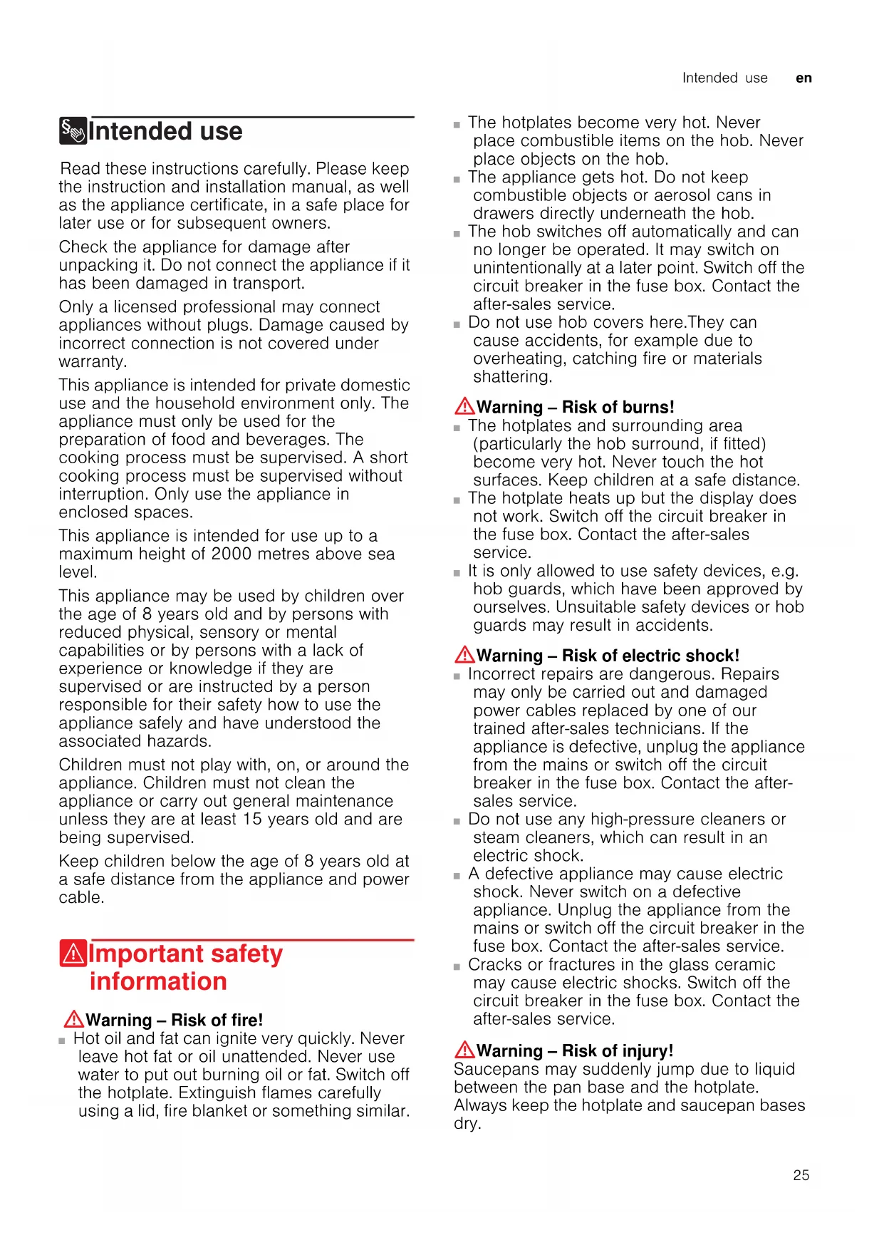 8Intended use Intended use Read these instructions carefully. Please keep the instruction and installation manual, as well as the appliance certificate, in a safe place for later use or for subsequent owners. Check the appliance for damage after unpacking it. Do not connect the appliance if it has been damaged in transport. Only a licensed professional may connect appliances without plugs. Damage caused by incorrect connection is not covered under warranty. This appliance is intended for private domestic use and the household environment only. The appliance must only be used for the preparation of food and beverages. The cooking process must be supervised. A short cooking process must be supervised without interruption. Only use the appliance in enclosed spaces. This appliance is intended for use up to a maximum height of 2000 metres above sea level. This appliance may be used by children over the age of 8 years old and by persons with reduced physical, sensory or mental capabilities or by persons with a lack of experience or knowledge if they are supervised or are instructed by a person responsible for their safety how to use the appliance safely and have understood the associated hazards. Children must not play with, on, or around the appliance. Children must not clean the appliance or carry out general maintenance unless they are at least 15 years old and are being supervised. Keep children below the age of 8 years old at a safe distance from the appliance and power cable. (Important safety information Impor t ant safety informat i on :Warning – Risk of fire! ■ Hot oil and fat can ignite very quickly. Never leave hot fat or oil unattended. Never use water to put out burning oil or fat. Switch off the hotplate. Extinguish flames carefully using a lid, fire blanket or something similar. Risk of fire! ■ The hotplates become very hot. Never place combustible items on the hob. Never place objects on the hob. Risk of fire! ■ The appliance gets hot. Do not keep combustible objects or aerosol cans in drawers directly underneath the hob. Risk of fire! ■ The hob switches off automatically and can no longer be operated. It may switch on unintentionally at a later point. Switch off the circuit breaker in the fuse box. Contact the after-sales service. Risk of burns! ■ Do not use hob covers here.They can cause accidents, for example due to overheating, catching fire or materials shattering. :Warning – Risk of burns! ■ The hotplates and surrounding area (particularly the hob surround, if fitted) become very hot. Never touch the hot surfaces. Keep children at a safe distance. Risk of burns! ■ The hotplate heats up but the display does not work. Switch off the circuit breaker in the fuse box. Contact the after-sales service. Risk of burns! ■ It is only allowed to use safety devices, e.g. hob guards, which have been approved by ourselves. Unsuitable safety devices or hob guards may result in accidents. :Warning – Risk of electric shock! ■ Incorrect repairs are dangerous. Repairs may only be carried out and damaged power cables replaced by one of our trained after-sales technicians. If the appliance is defective, unplug the appliance from the mains or switch off the circuit breaker in the fuse box. Contact the after- sales service. Risk of electric shock! ■ Do not use any high-pressure cleaners or steam cleaners, which can result in an electric shock. Risk of electric shock! ■ A defective appliance may cause electric shock. Never switch on a defective appliance. Unplug the appliance from the mains or switch off the circuit breaker in the fuse box. Contact the after-sales service. Risk of electric shock! ■ Cracks or fractures in the glass ceramic may cause electric shocks. Switch off the circuit breaker in the fuse box. Contact the after-sales service. :Warning – Risk of injury! Saucepans may suddenly jump due to liquid between the pan base and the hotplate. Always keep the hotplate and saucepan bases dry.en Causes of damage
