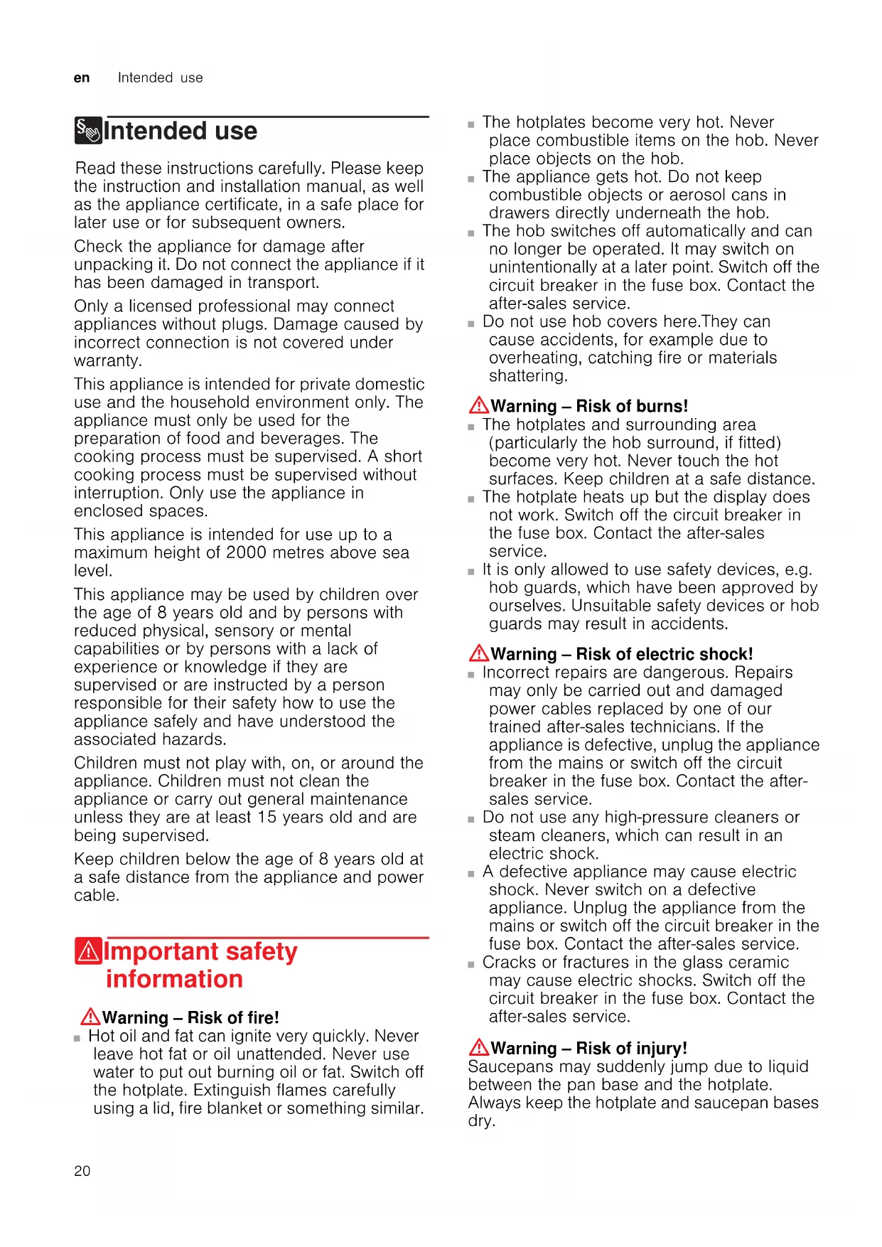 8Intended use Intended use Read these instructions carefully. Please keep the instruction and installation manual, as well as the appliance certificate, in a safe place for later use or for subsequent owners. Check the appliance for damage after unpacking it. Do not connect the appliance if it has been damaged in transport. Only a licensed professional may connect appliances without plugs. Damage caused by incorrect connection is not covered under warranty. This appliance is intended for private domestic use and the household environment only. The appliance must only be used for the preparation of food and beverages. The cooking process must be supervised. A short cooking process must be supervised without interruption. Only use the appliance in enclosed spaces. This appliance is intended for use up to a maximum height of 2000 metres above sea level. This appliance may be used by children over the age of 8 years old and by persons with reduced physical, sensory or mental capabilities or by persons with a lack of experience or knowledge if they are supervised or are instructed by a person responsible for their safety how to use the appliance safely and have understood the associated hazards. Children must not play with, on, or around the appliance. Children must not clean the appliance or carry out general maintenance unless they are at least 15 years old and are being supervised. Keep children below the age of 8 years old at a safe distance from the appliance and power cable. (Important safety information Impor t ant saf et y informat i on :Warning – Risk of fire! ■ Hot oil and fat can ignite very quickly. Never leave hot fat or oil unattended. Never use water to put out burning oil or fat. Switch off the hotplate. Extinguish flames carefully using a lid, fire blanket or something similar. Risk of fire! ■ The hotplates become very hot. Never place combustible items on the hob. Never place objects on the hob. Risk of fire! ■ The appliance gets hot. Do not keep combustible objects or aerosol cans in drawers directly underneath the hob. Risk of fire! ■ The hob switches off automatically and can no longer be operated. It may switch on unintentionally at a later point. Switch off the circuit breaker in the fuse box. Contact the after-sales service. Risk of burns! ■ Do not use hob covers here.They can cause accidents, for example due to overheating, catching fire or materials shattering. :Warning – Risk of burns! ■ The hotplates and surrounding area (particularly the hob surround, if fitted) become very hot. Never touch the hot surfaces. Keep children at a safe distance. Risk of burns! ■ The hotplate heats up but the display does not work. Switch off the circuit breaker in the fuse box. Contact the after-sales service. Risk of burns! ■ It is only allowed to use safety devices, e.g. hob guards, which have been approved by ourselves. Unsuitable safety devices or hob guards may result in accidents. :Warning – Risk of electric shock! ■ Incorrect repairs are dangerous. Repairs may only be carried out and damaged power cables replaced by one of our trained after-sales technicians. If the appliance is defective, unplug the appliance from the mains or switch off the circuit breaker in the fuse box. Contact the after- sales service. Risk of electric shock! ■ Do not use any high-pressure cleaners or steam cleaners, which can result in an electric shock. Risk of electric shock! ■ A defective appliance may cause electric shock. Never switch on a defective appliance. Unplug the appliance from the mains or switch off the circuit breaker in the fuse box. Contact the after-sales service. Risk of electric shock! ■ Cracks or fractures in the glass ceramic may cause electric shocks. Switch off the circuit breaker in the fuse box. Contact the after-sales service. :Warning – Risk of injury! Saucepans may suddenly jump due to liquid between the pan base and the hotplate. Always keep the hotplate and saucepan bases dry.Causes of damage en