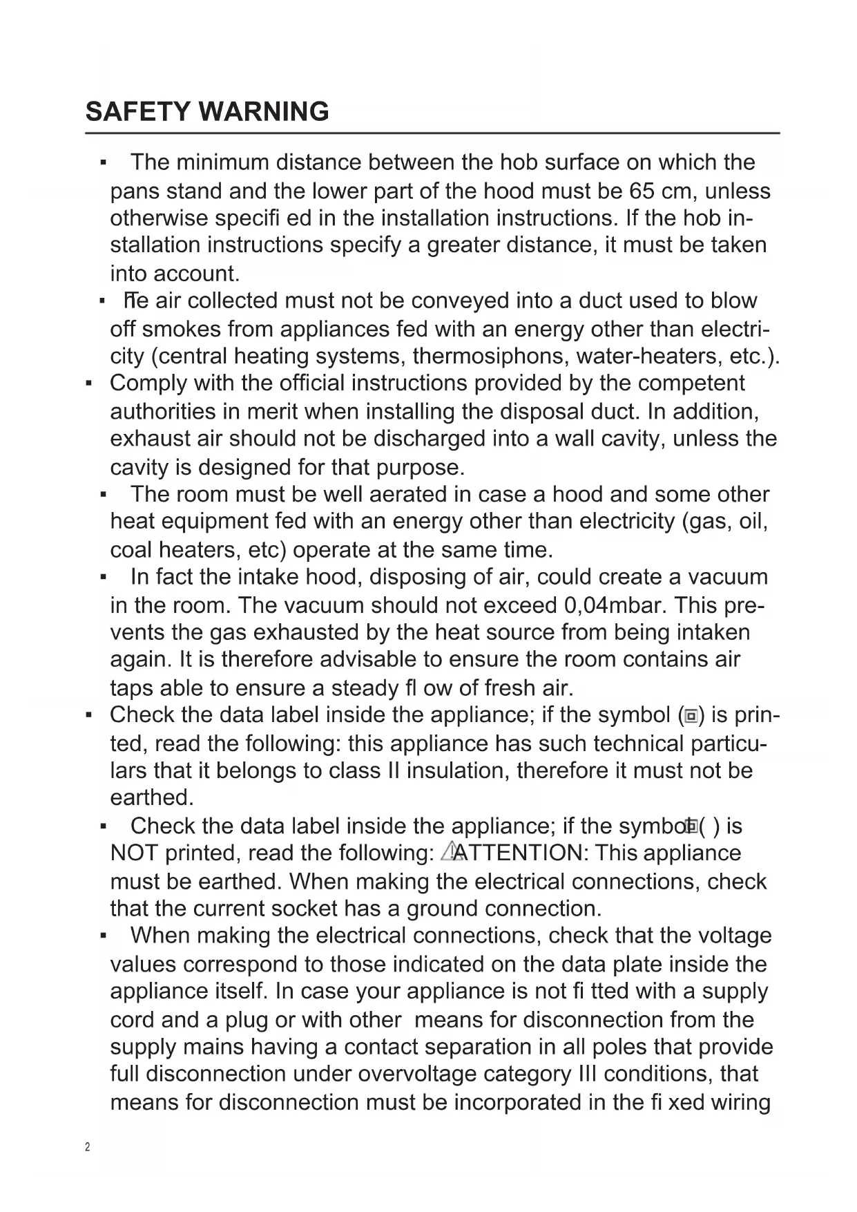 - In fact the intake hood, disposing of air, could create a vacuum in the room. The vacuum should not exceed 0,04mbar. This pre- vents the gas exhausted by the heat source from being intaken again. It is therefore advisable to ensure the room contains air taps able to ensure a steady fl ow of fresh air.