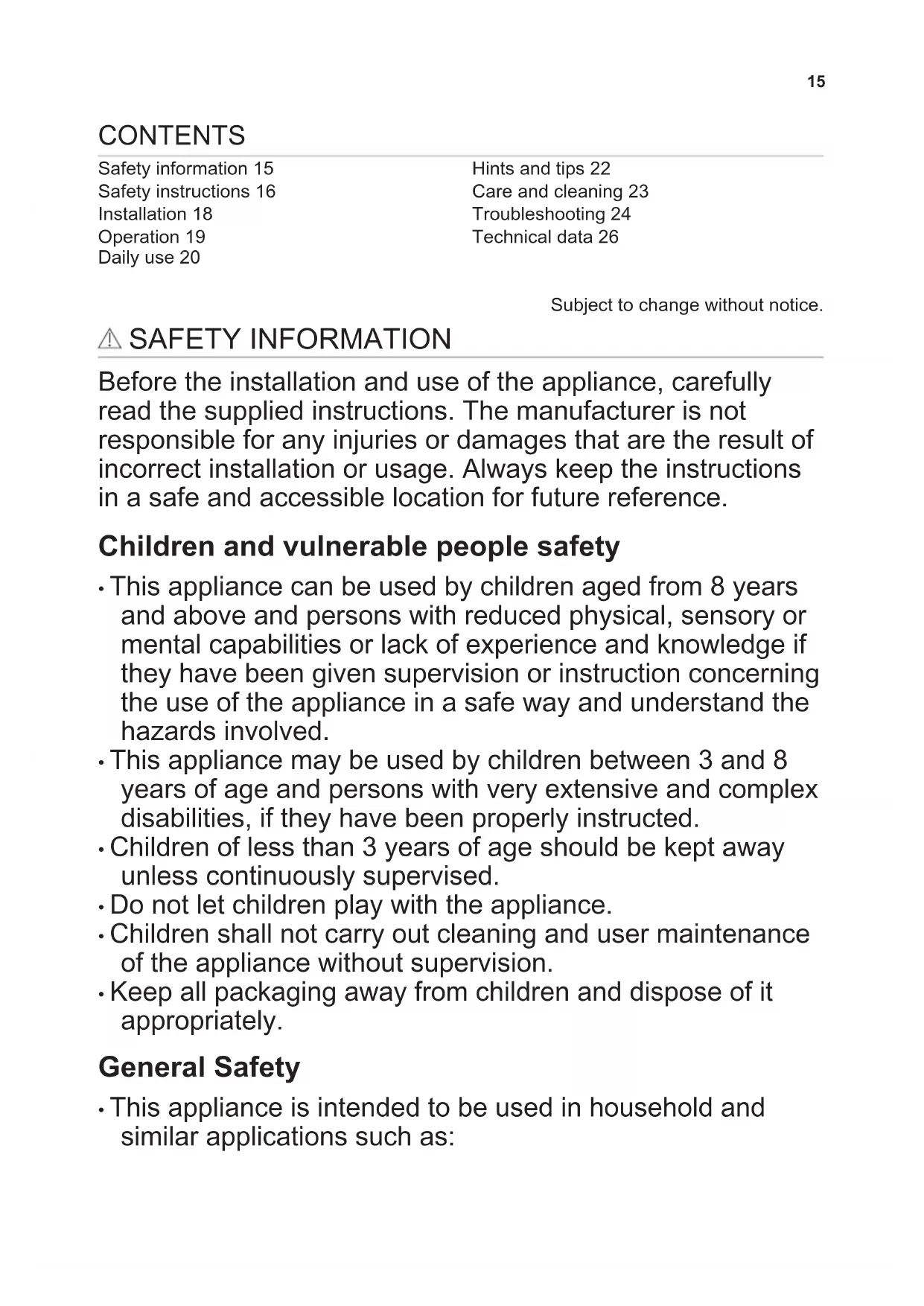 - This appliance may be used by children between 3 and 8 years of age and persons with very extensive and complex disabilities, if they have been properly instructed.
