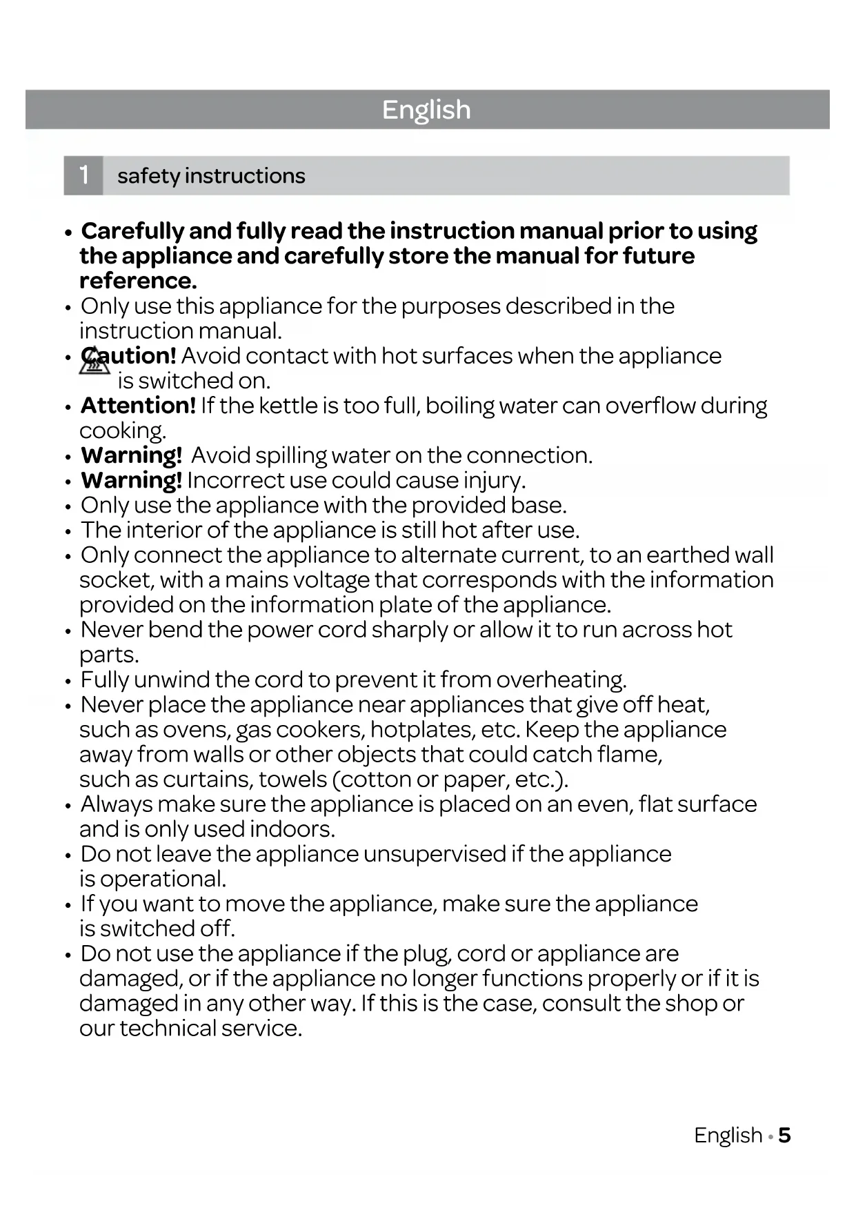 - Do not use the appliance if the plug, cord or appliance are damaged, or if the appliance no longer functions properly or if it is damaged in any other way. If this is the case, consult the shop or our technical service. English safety instructions