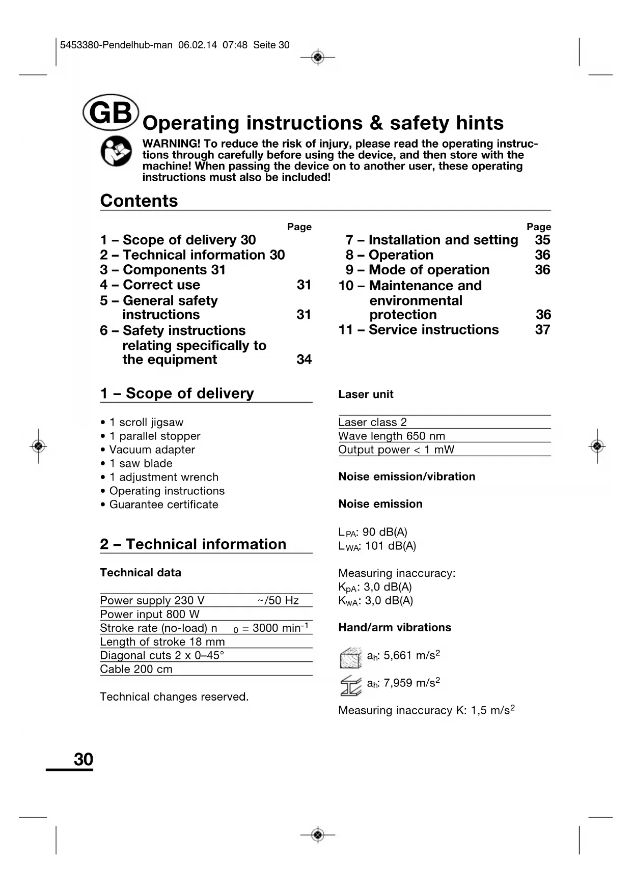 Page 1 – Scope of delivery 30 2 – Technical information 30 3 – Components 31 4 – Correct use 31 5 – General safety instructions 31 6 – Safety instructions relating specifically to the equipment 34 Page 7 – Installation and setting 35 8 – Operation 36 9 – Mode of operation 36 10 – Maintenance and environmental protection 36 11 – Service instructions 37 Contents 5453380-Pendelhub-man 06.02.14 07:48 Seite 3031 Noise/vibration information Measured values determined in accordance with EN 60745-1, EN 60745-2-11. The specified vibration emission value was measured in accordance with a standardised test procedure and can be used in order to compare one electrical tool with another. The specified vibration emission value can also be used for preliminary evaluation of the disturbance. CAUTION! The vibration emission value may fluctuate from the specified value during use of the electrical tool. These fluctuations will depend on the way in which the tool is used. Safety measures must be taken in order to protect the operator. As a result, the evaluation of the disturbance must be made whilst taking account of the actual conditions of use. (All parts of the operating cycle must be taken into account for this purpose. This also includes times in which the tool is switched off and times in which it is switched on, but is running without load.) 3 – Components 1 On/Off switch 2 Stroke rate pre-selection 3 Locking button 4 Pendulum 5 Connection cable 6 Cut protection element 7 Connection for the dust extraction/ vacuum adapter 8 Cutting angle setting 9 Guide roll 10 Saw shoe 11 Parallel stopper 12 Adjustment wrench 13 Laser optic 14 On/Off switch for laser 4 – Correct use Subject to the specified cutting rates and when appropriate accessories are used (Heed manufacturer’s data), this jigsaw is suitable for sawing wood, metal, ceramics and panels of plastic or mineral fibre. All other applications are expressly ruled out. The machine is intended only for use in the household. 5 – General safety instructions for handling power tools WARNING! Read all safety warnings and all instructions. Failure to follow the warnings and instructions may result in electric shock, fire and/or serious injury. Save all warnings and instructions for future reference. The term “power tool” in the warnings refers to your mains operated (corded) power tool or battery-operated (cordless) power tool. This unit may not be used by people (including children) with reduced physical, sensory or mental capacities, with a lack of experience and without the appropriate knowledge, unless they are supervised by someone who is 5453380-Pendelhub-man 06.02.14 07:48 Seite 3132 responsible for their safety or have been instructed by such a person with regard to how the unit is to be operated. Children should be supervised to ensure that they do not play with the device. 1 Work area a Keep work area clean and well lit. Cluttered and dark areas invite accidents. b Do not operate power tools in explosive atmospheres, such as in the presence of flammable liquids, gases or dust. Power tools create sparks which may ignite the dust or fumes. c Keep children and bystanders away while operating a power tool. Distractions can cause you to lose control. 2 Electrical Safety a Power tool plugs must match the outlet. Never modify the plug in any way. Do not use any adapter plugs with earthed (grounded) power tools. Unmodified plugs and matching outlets will reduce risk of electric shock. b Avoid body contact with earthed or grounded surfaces, such as pipes, radiators, ranges and refrigerators. There is an increased risk of electric shock if your body is earthed or grounded. c Do not expose power tools to rain or wet conditions. Water entering a power tool will increase the risk of electric shock. d Do not abuse the cord. Never use the cord for carrying, pulling or unplugging the power tool. Keep cord away from heat, oil, sharp edges or moving parts. Damaged or entangled cords increase the risk of electric shock. e When operating a power tool outdoors, use an extension cord suitable for outdoor use. Use of a cord suitable for outdoor use reduces the risk of electric shock. f If it is not possible to avoid using the electrical tool in a damp environment, use a residual current circuit-breaker. The use of a residual current circuit-breaker reduces the risk of an electrical shock. 3 Personal safety a Stay alert, watch what you are doing and use common sense when operating a power tool. Do not use a power tool while you are tired or under the influence of drugs, alcohol or medication. A moment of inattention while operating power tools may result in serious personal injury. b Use personal protective equipment. Always wear eye protection. Protective equipment such as dust masks, non- skid safety shoes, hard hat, or hearing protection used for appropriate conditions will reduce personal injuries. c Prevent unintentional starting. Ensure the switch is in the off- position before connecting to power source and/or battery pack, picking up or carrying the tool. Carrying power tools with your finger on the switch or energising power tools that have the switch on invites accidents. d Remove any adjusting key or wrench before turning the power tool on. A 5453380-Pendelhub-man 06.02.14 07:48 Seite 3233 wrench or a key left attached to a rotating part of the power tool may result in personal injury. e Do not overreach. Keep proper footing and balance at all times. This enables better control of the power tool in unexpected situations. f Dress properly. Do not wear loose clothing or jewellery. Keep your hair, clothing and gloves away from moving parts. Loose clothes, jewellery or long hair can be caught in moving parts. g Keep handles dry, clean and free from oil and grease. Slippery handles do not allow for safe handling and control of the tool in unexpected situations. h If devices are provided for the connection of dust extraction and coll