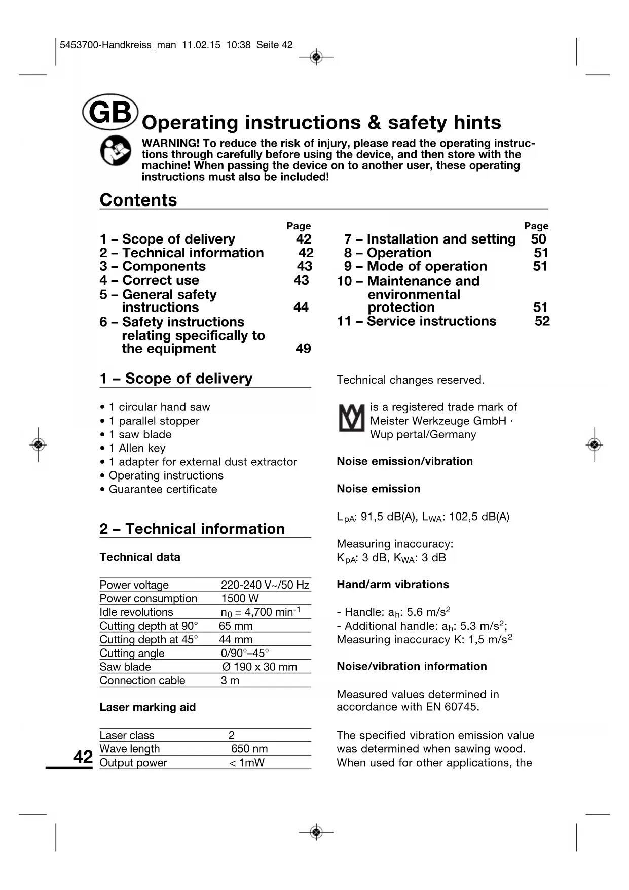 Page 1 – Scope of delivery 42 2 – Technical information 42 3 – Components 43 4 – Correct use 43 5 – General safety instructions 44 6 – Safety instructions relating specifically to the equipment 49 Page 7 – Installation and setting 50 8 – Operation 51 9 – Mode of operation 51 10 – Maintenance and environmental protection 51 11 – Service instructions 52 Contents