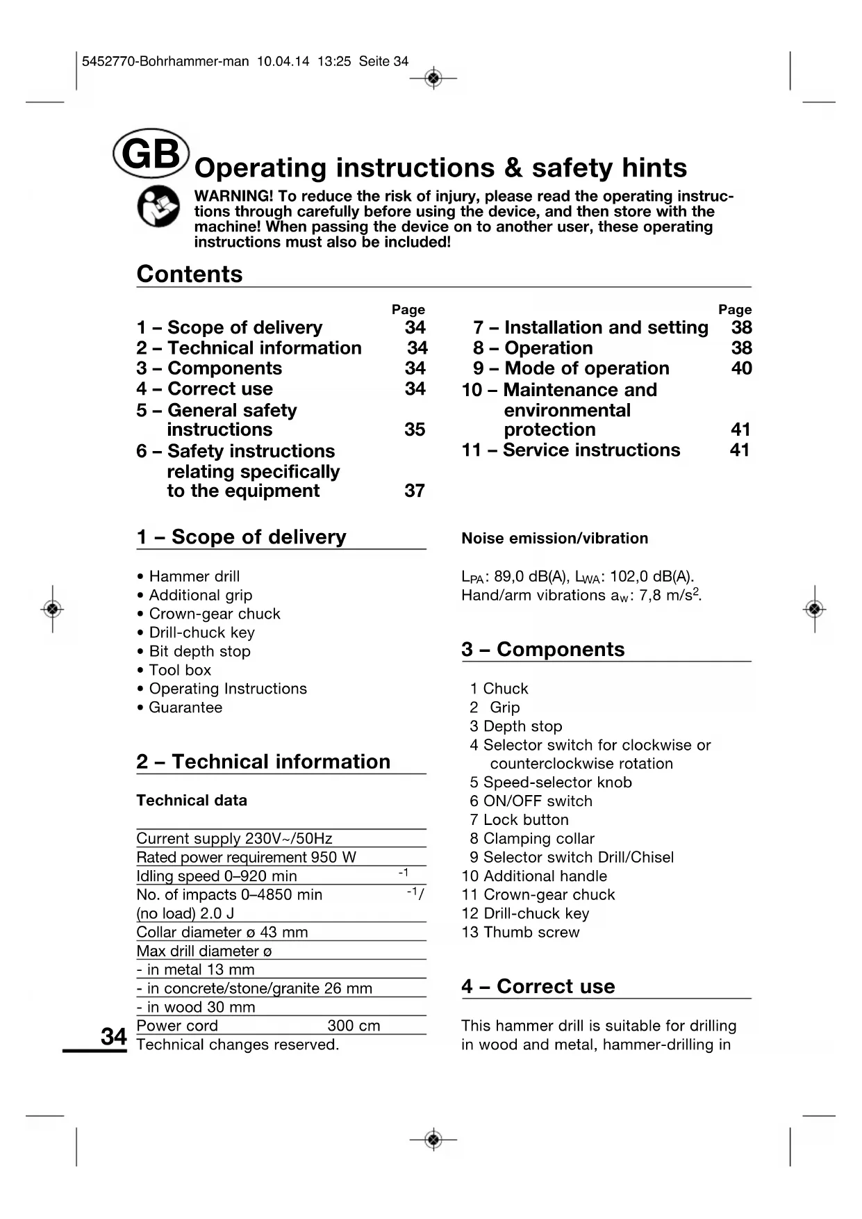 Page 1 – Scope of delivery 34 2 – Technical information 34 3 – Components 34 4 – Correct use 34 5 – General safety instructions 35 6 – Safety instructions relating specifically to the equipment 37 Page 7 – Installation and setting 38 8 – Operation 38 9 – Mode of operation 40 10 – Maintenance and environmental protection 41 11 – Service instructions 41 Contents 5452770-Bohrhammer-man 10.04.14 13:25 Seite 3435 masonry and inserting screws into wood and metal in the household.The hammer drill also has a chiselling function for working in masonry. Use suitable accessories only (see manufacturer’s directions). All other applications are expressly excluded. The machine is intended only for use in the household. 5 – General safety instructions for handling power tools WARNING! Read all safety warnings and all instructions. Failure to follow the warnings and instructions may result in electric shock, fire and/or serious injury. Save all warnings and instructions for future reference. The term “power tool” in the warnings refers to your mains operated (corded) power tool or battery-operated (cordless) power tool. Work area