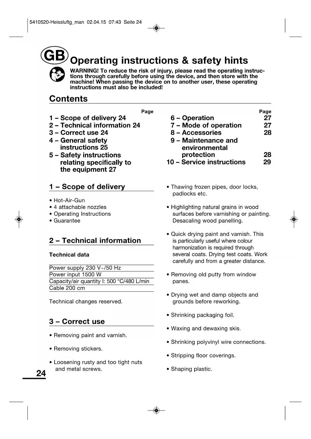 Page 1 – Scope of delivery 24 2 – Technical information 24 3 – Correct use 24 4 – General safety instructions 25 5 – Safety instructions relating specifically to the equipment 27 Page 6 – Operation 27 7 – Mode of operation 27 8 – Accessories 28 9 – Maintenance and environmental protection 28 10 – Service instructions 29 Contents