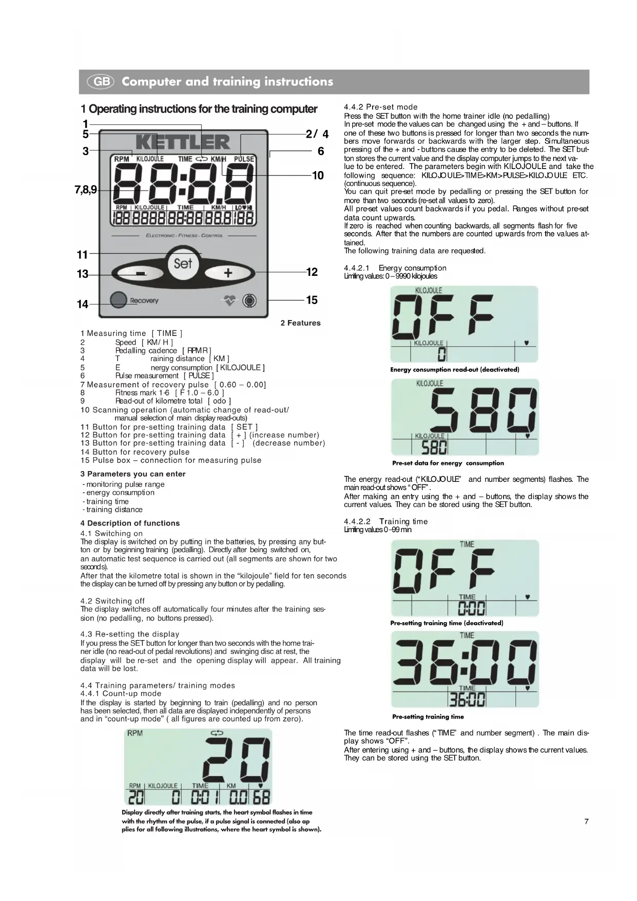 During training the data of the lower displays in scan mode (automatic change of read-out) are shown for five seconds each in the central dis- play. The data is shown in the following order DISTAN CE > KILOJO ULES> TIME > KM >KM/ H >PULSE >RPM . etc. (continuous) If the SET button is pressed the “ ?” display goes out and the user can call up the other read-outs in the main display by pressing the + or – button. Th i s r e a d -o ut w i l l r e ma i n u nt i l t he + o r – b ut to n i s u se d t o c a l l u p a n o t he r read-out or the SET button is pressed to reactivate the scan mode. The data that appears in the central main display can be identified by the identification code above the read-out.At the beginning of training the scan mod e is a lw ays acti vated . Thi s i s also the case i f tra ini ng i s i nter- rupted and started again, regardless of the previous setting.