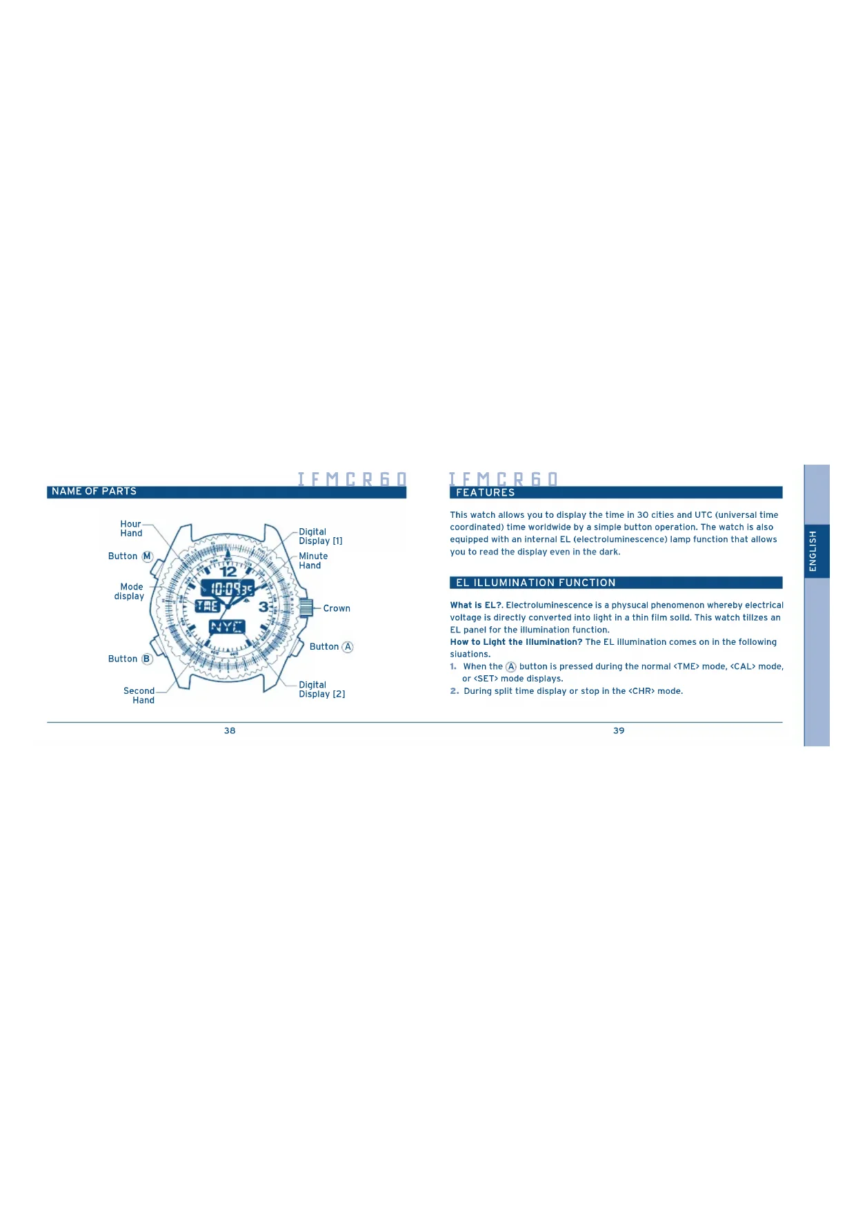 This watch allows you to display the time in 30 cities and UTC (universal time coordinated) time worldwide by a simple button operation. The watch is also equipped with an internal EL (electroluminescence) lamp function that allows you to read the display even in the dark.