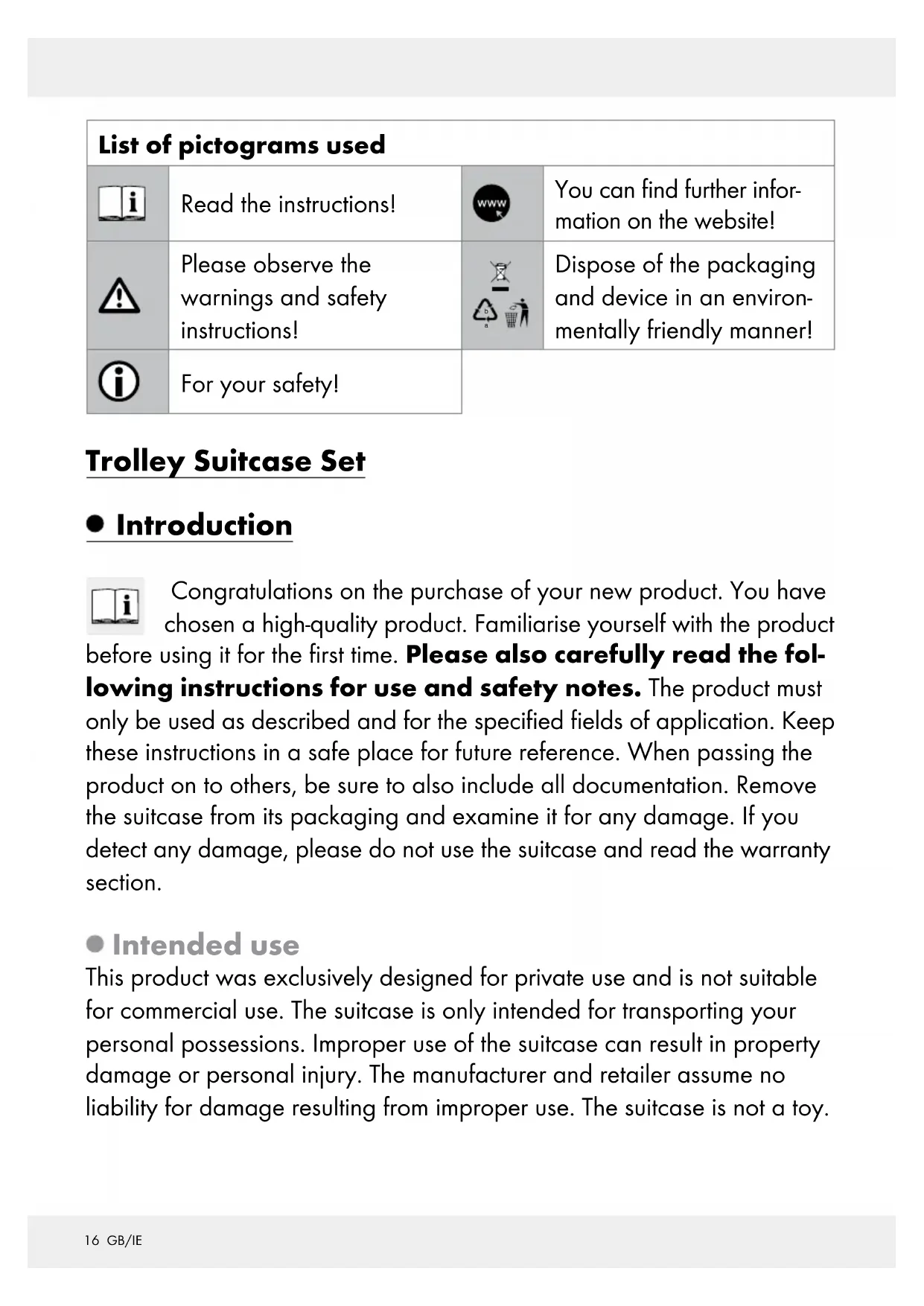 Dispose of the packaging and device in an environ- mentally friendly manner! For your safety! Trolley Suitcase Set Introduction Congratulations on the purchase of your new product. You have chosen a high-quality product. Familiarise yourself with the product before using it for the first time. Please also carefully read the fol- lowing instructions for use and safety notes. The product must only be used as described and for the specified fields of application. Keep these instructions in a safe place for future reference. When passing the product on to others, be sure to also include all documentation. Remove the suitcase from its packaging and examine it for any damage. If you detect any damage, please do not use the suitcase and read the warranty section. Intended use This product was exclusively designed for private use and is not suitable for commercial use. The suitcase is only intended for transporting your personal possessions. Improper use of the suitcase can result in property damage or personal injury. The manufacturer and retailer assume no liability for damage resulting from improper use. The suitcase is not a toy.17 GB/IE Parts description
