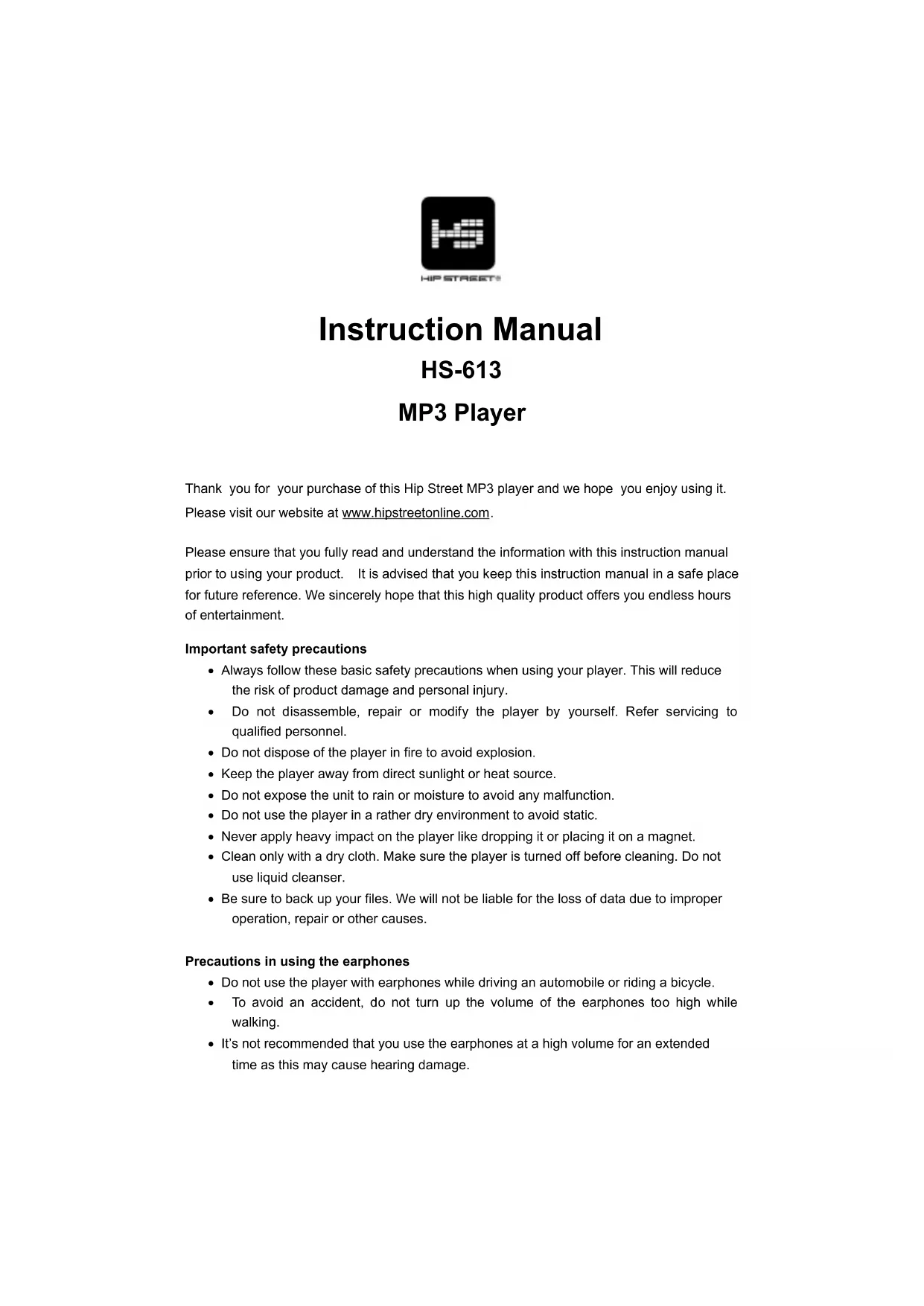 Instruction Manual HS-613 MP3 Player Thank you for your purchase of this Hip Street MP3 player and we hope you enjoy using it. Please visit our website at www.hipstreetonline.com