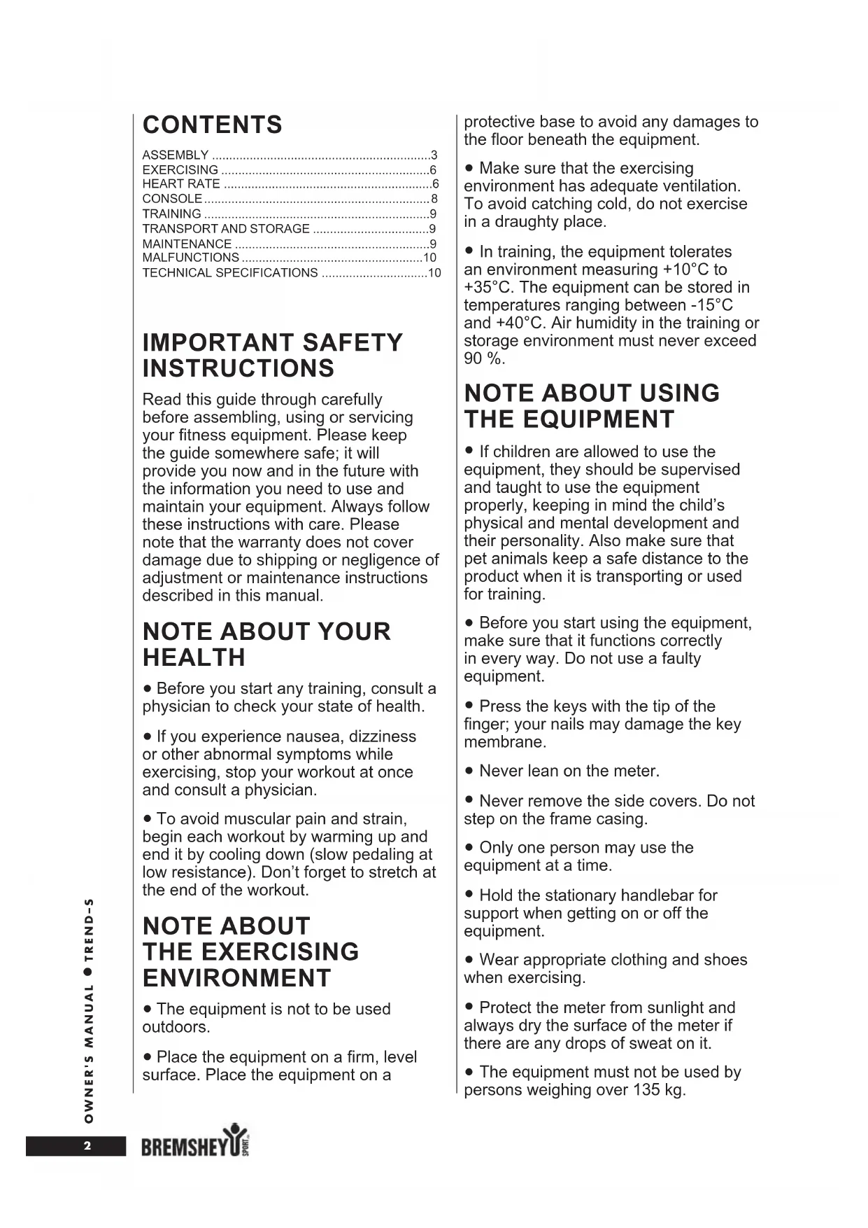 TREND–S IMPORTANT SAFETY INSTRUCTIONS Read this guide through carefully before assembling, using or servicing your fitness equipment. Please keep the guide somewhere safe; it will provide you now and in the future with the information you need to use and maintain your equipment. Always follow these instructions with care. Please note that the warranty does not cover damage due to shipping or negligence of adjustment or maintenance instructions described in this manual.