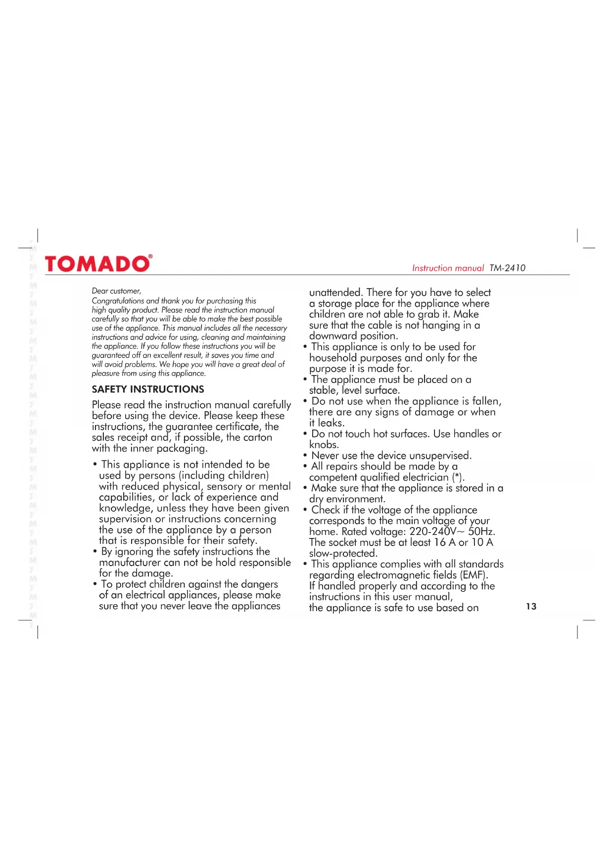 - The warranty does not apply when defects or damages result from an accident, misuse, negligence (e.g. incorrect cleansing), or when repairs of alterations have been executed outside the authorized TOMADO service centre (excl. disassembling, as stated in the instruction manual).