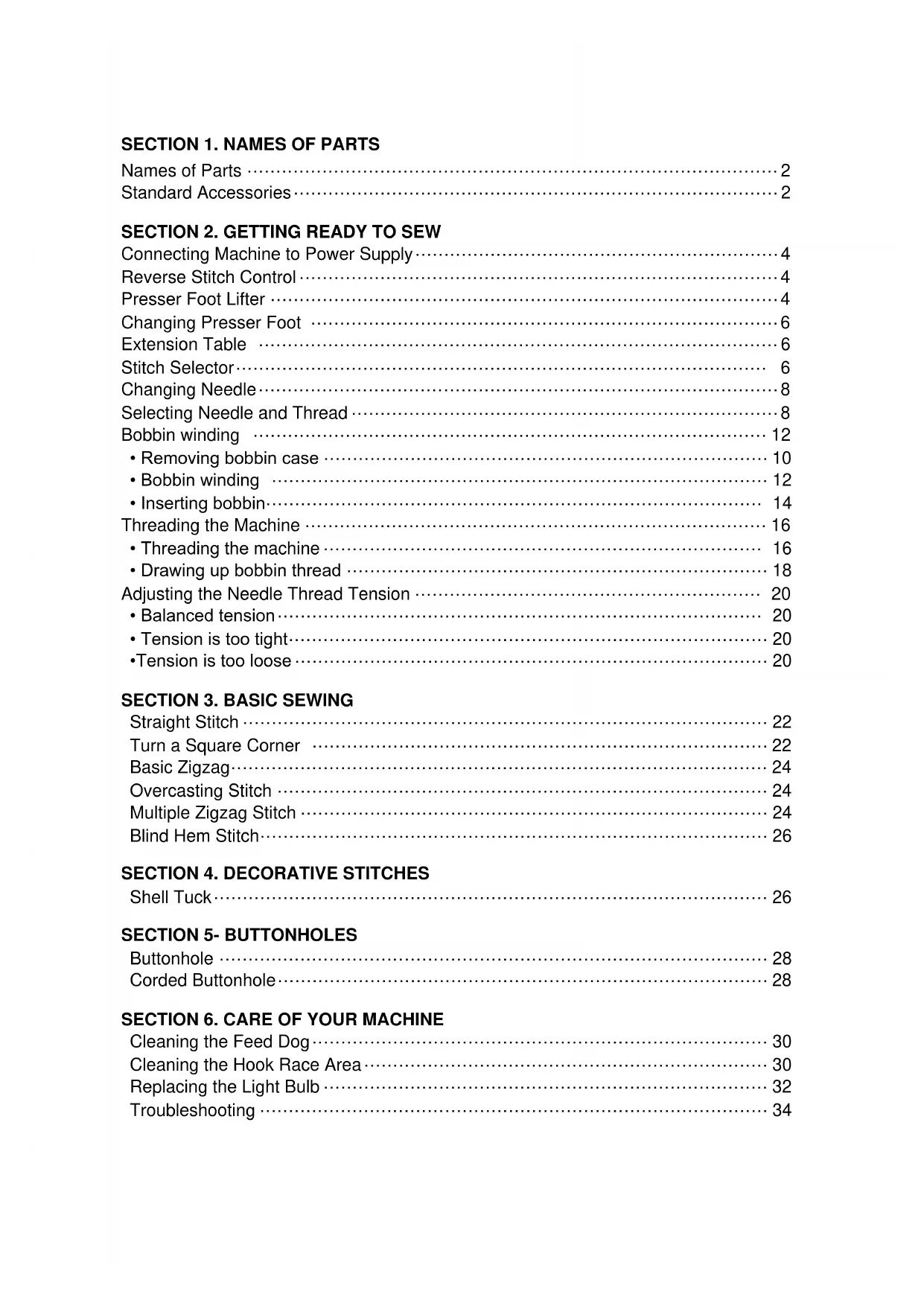 Cleaning the Feed Dog ··············································································· 30 Cleaning the Hook Race Area ······································································ 30 Replacing the Light Bulb ············································································· 32 Troubleshooting ························································································ 34SECCION 1.NOMBRE DE LAS PARTES Nombre de las partes ··················································································· 3 Accessorios Estándares ··············································································· 3 SECCION 2. PREPARACION DE LA MAQUINA PARA COSER Conexión de la máquina a la red eléctrica·························································· 5 Control de puntada reversa ··········································································· 5 Palanca de elevación del prénsatelas ······························································· 5 Cambio del prénsatelas ················································································· 7 Ampliación móvil de la superficie de costura ····················································· 7 Selector de patrón························································································· 7 Cómo y cuándo cambiar la aguja ····································································· 9 Seleccionarlas agujas y los hilos ······································································ 9 Embobinado de la canilla ············································································· 11
