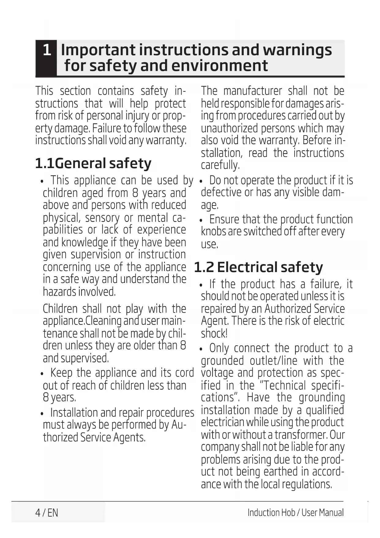 - Only connect the product to a grounded outlet/line with the voltage and protection as spec- ified in the “Technical specifi- cations”. Have the grounding installation made by a qualified electrician while using the product with or without a transformer. Our company shall not be liable for any problems arising due to the prod- uct not being earthed in accord- ance with the local regulations. 1 Importantinstructionsandwarnings forsafetyandenvironment5 / EN Induction Hob / User Manual 1 Importantinstructionsandwarnings forsafetyandenvironment
