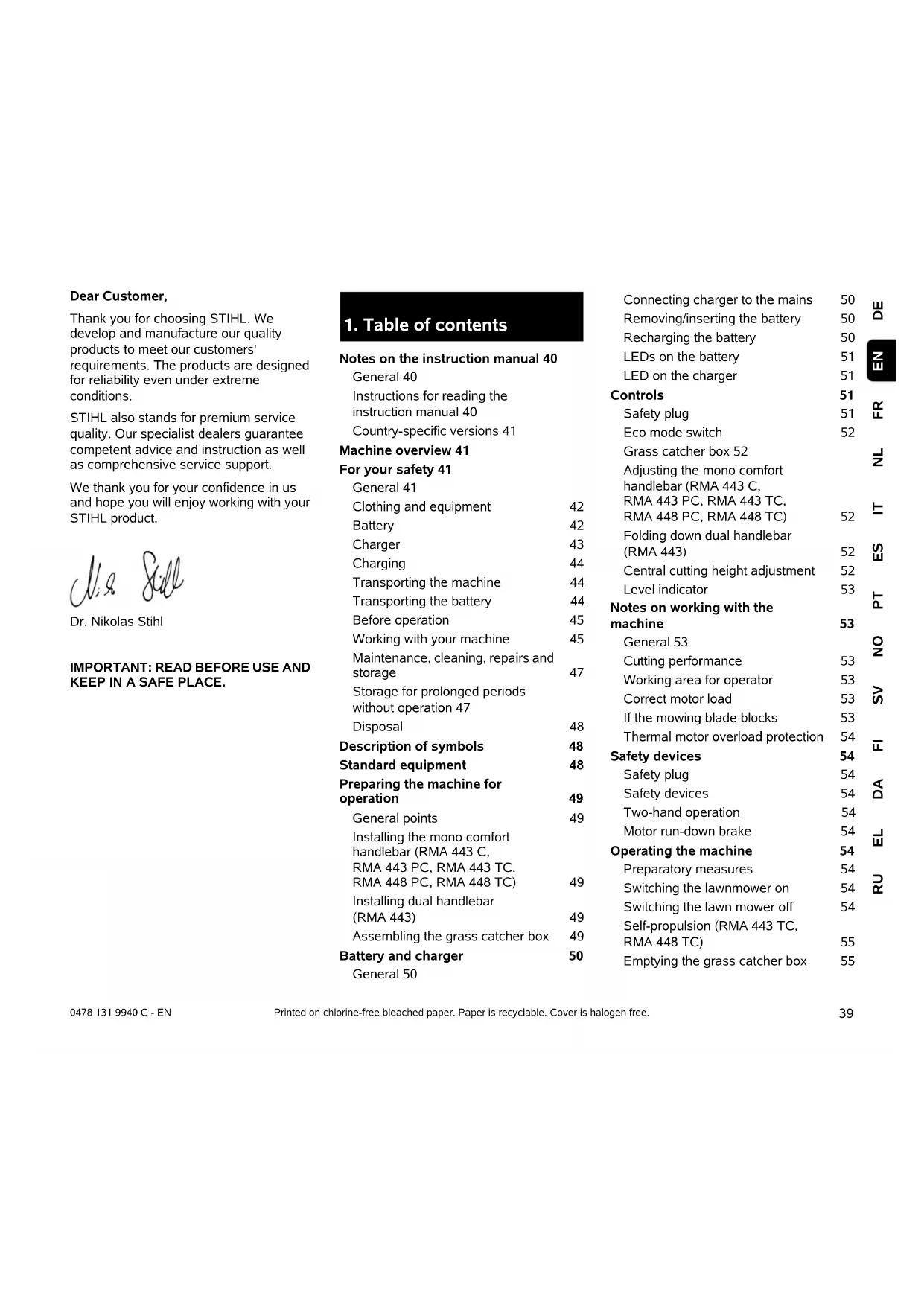 DEFRNLITESPTNOSVFIDAELRU EN 0478 131 9940 C - EN Dear Customer, Thank you for choosing STIHL. We develop and manufacture our quality products to meet our customers' requirements. The products are designed for reliability even under extreme conditions. STIHL also stands for premium service quality. Our specialist dealers guarantee competent advice and instruction as well as comprehensive service support. We thank you for your confidence in us and hope you will enjoy working with your STIHL product. Dr. Nikolas Stihl