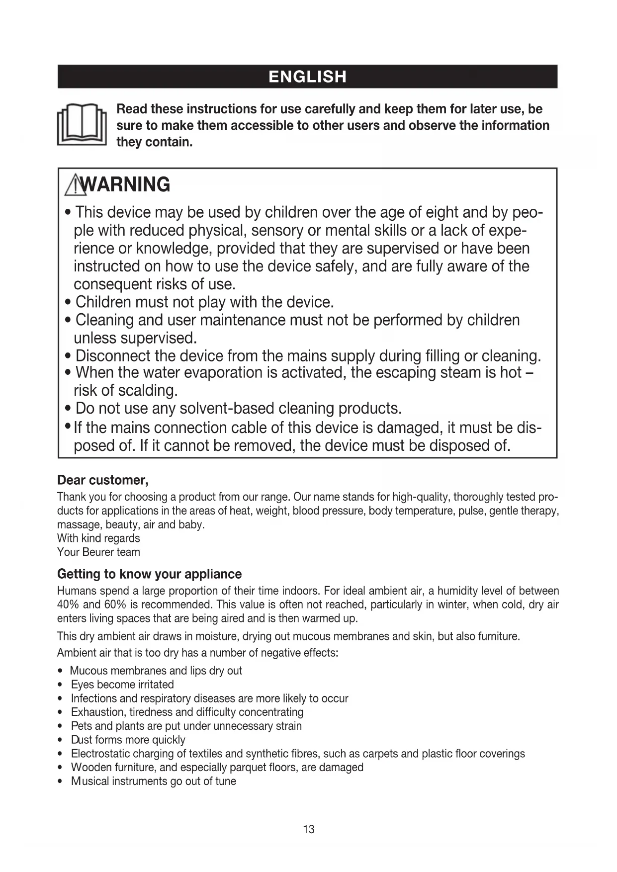 If the mains connection cable of this device is damaged, it must be dis- posed of. If it cannot be removed, the device must be disposed of. Dear customer, Thank you for choosing a product from our range. Our name stands for high-quality, thoroughly tested pro- ducts for applications in the areas of heat, weight, blood pressure, body temperature, pulse, gentle therapy, massage, beauty, air and baby. With kind regards Your Beurer team Getting to know your appliance Humans spend a large proportion of their time indoors. For ideal ambient air, a humidity level of between 40% and 60% is recommended. This value is often not reached, particularly in winter, when cold, dry air enters living spaces that are being aired and is then warmed up. This dry ambient air draws in moisture, drying out mucous membranes and skin, but also furniture. Ambient air that is too dry has a number of negative effects:
