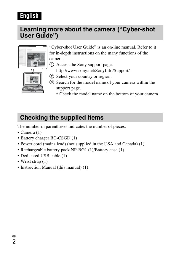 English Learning more about the camera (“Cyber-shot User Guide”) “Cyber-shot User Guide” is an on-line manual. Refer to it for in-depth instructions on the many functions of the camera. 1 Access the Sony support page. http://www.sony.net/SonyInfo/Support/ 2 Select your country or region. 3 Search for the model name of your camera within the support page.