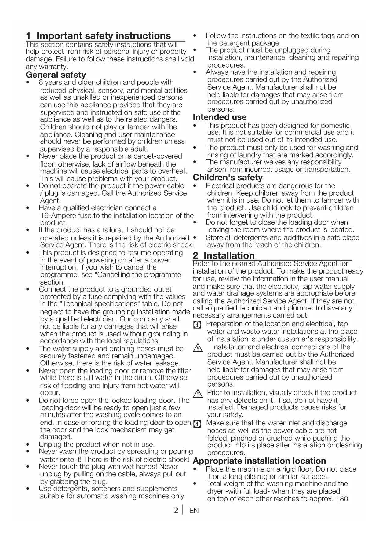 - Storealldetergentsandadditivesinasafeplace away from the reach of the children. 2 Installation Refer to the nearest Authorised Service Agent for installation of the product. To make the product ready for use, review the information in the user manual and make sure that the electricity, tap water supply and water drainage systems are appropriate before callingtheAuthorizedServiceAgent.Iftheyarenot, callaqualifiedtechnicianandplumbertohaveany necessary arrangements carried out.