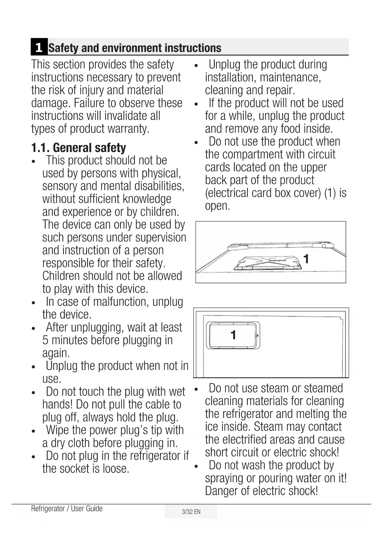 - Do not wash the product by spraying or pouring water on it! Danger of electric shock! 1 Safety and environment instructionsSafety and environment instructions 4 /32 EN Refrigerator / User Guide