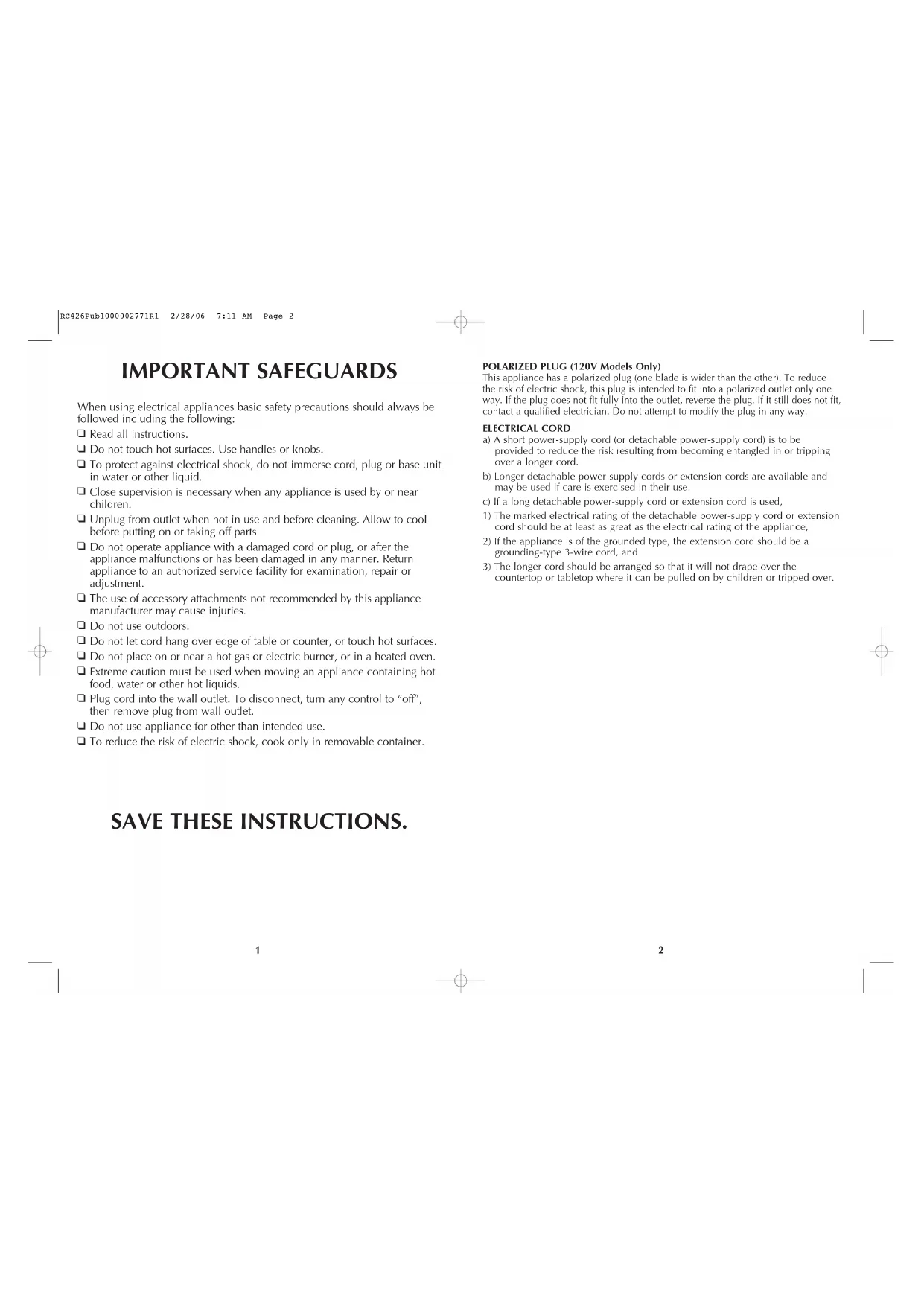 To reduce the risk of electric shock, cook only in removable container. IMPORTANT SAFEGUARDS SAVE THESE INSTRUCTIONS. POLARIZED PLUG (120V Models Only) This appliance has a polarized plug (one blade is wider than the other). To reduce the risk of electric shock, this plug is intended to fit into a polarized outlet only one way. If the plug does not fit fully into the outlet, reverse the plug. If it still does not fit, contact a qualified electrician. Do not attempt to modify the plug in any way. ELECTRICAL CORD a) A short power-supply cord (or detachable power-supply cord) is to be provided to reduce the risk resulting from becoming entangled in or tripping over a longer cord. b) Longer detachable power-supply cords or extension cords are available and may be used if care is exercised in their use. c) If a long detachable power-supply cord or extension cord is used,