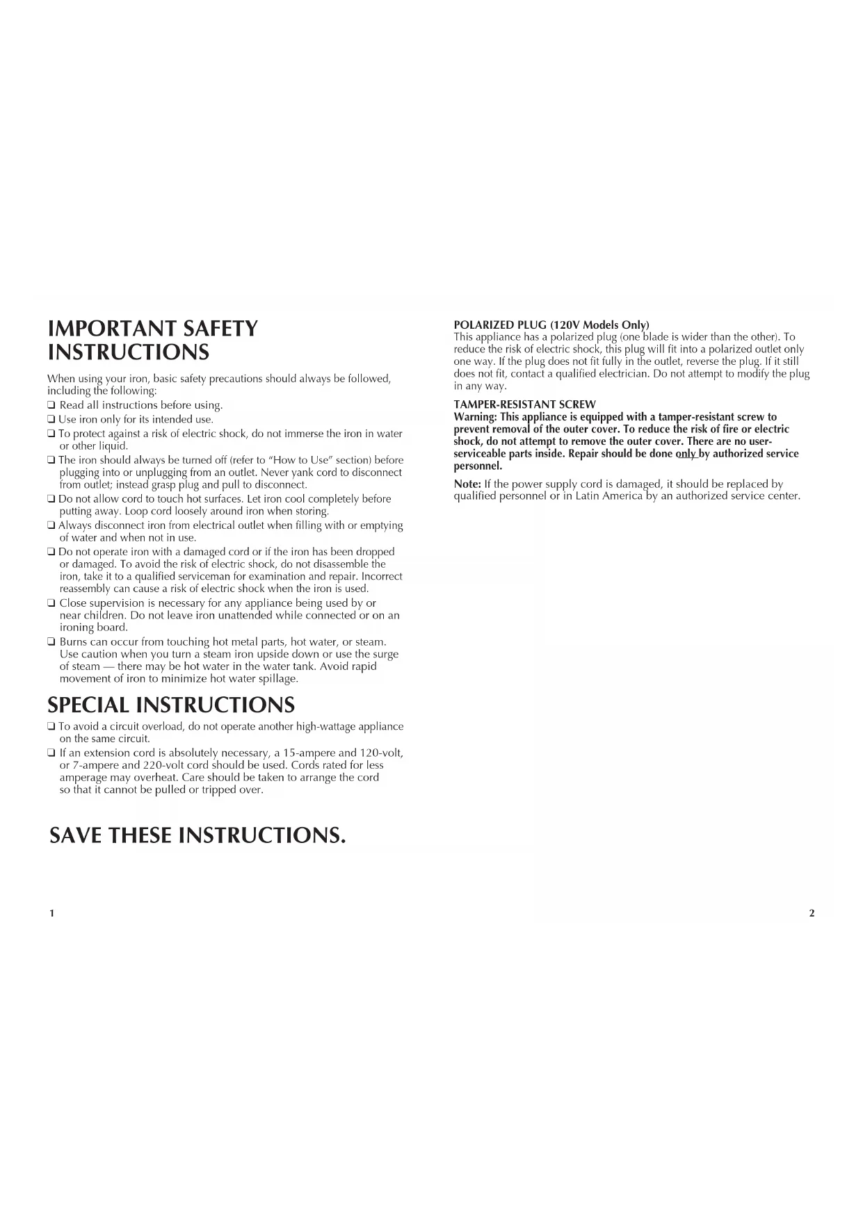 Burns can occur from touching hot metal parts, hot water, or steam. Use caution when you turn a steam iron upside down or use the surge of steam — there may be hot water in the water tank. Avoid rapid movement of iron to minimize hot water spillage. SPECIAL INSTRUCTIONS ❑ To avoid a circuit overload, do not operate another high-wattage appliance on the same circuit.