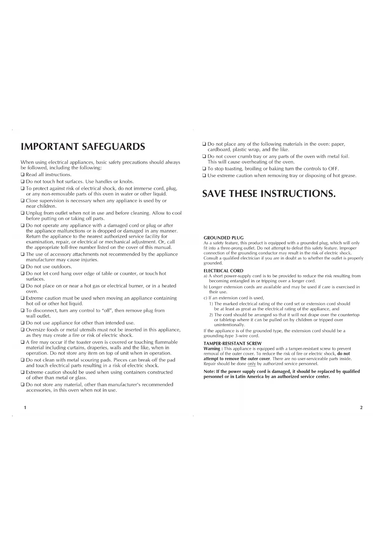 When using electrical appliances, basic safety precautions should always be followed, including the following: ❑ Read all instructions. ❑ Do not touch hot surfaces. Use handles or knobs. ❑ To protect against risk of electrical shock, do not immerse cord, plug, or any non-removable parts of this oven in water or other liquid. ❑ Close supervision is necessary when any appliance is used by or near children. ❑ Unplug from outlet when not in use and before cleaning. Allow to cool before putting on or taking off parts. ❑ Do not operate any appliance with a damaged cord or plug or after the appliance malfunctions or is dropped or damaged in any manner. Return the appliance to the nearest authorized service facility for examination, repair, or electrical or mechanical adjustment. Or, call the appropriate toll-free number listed on the cover of this manual. ❑ The use of accessory attachments not recommended by the appliance manufacturer may cause injuries. ❑ Do not use outdoors. ❑ Do not let cord hang over edge of table or counter, or touch hot surfaces. ❑ Do not place on or near a hot gas or electrical burner, or in a heated oven. ❑ Extreme caution must be used when moving an appliance containing hot oil or other hot liquid. ❑ To disconnect, turn any control to “off”, then remove plug from wall outlet. ❑ Do not use appliance for other than intended use. ❑ Oversize foods or metal utensils must not be inserted in this appliance, as they may create a fire or risk of electric shock. ❑ A fire may occur if the toaster oven is covered or touching flammable material including curtains, draperies, walls and the like, when in operation. Do not store any item on top of unit when in operation. ❑ Do not clean with metal scouring pads. Pieces can break off the pad and touch electrical parts resulting in a risk of electric shock. ❑ Extreme caution should be used when using containers constructed of other than metal or glass. ❑ Do not store any material, other than manufacturer's recommended accessories, in this oven when not in use. IMPORTANT SAFEGUARDS SAVE THESE INSTRUCTIONS. GROUNDED PLUG As a safety feature, this product is equipped with a grounded plug, which will only fit into a three-prong outlet. Do not attempt to defeat this safety feature. Improper connection of the grounding conductor may result in the risk of electric shock. Consult a qualified electrician if you are in doubt as to whether the outlet is properly grounded. ELECTRICAL CORD a) A short power-supply cord is to be provided to reduce the risk resulting from becoming entangled in or tripping over a longer cord. b) Longer extension cords are available and may be used if care is exercised in their use. c) If an extension cord is used,