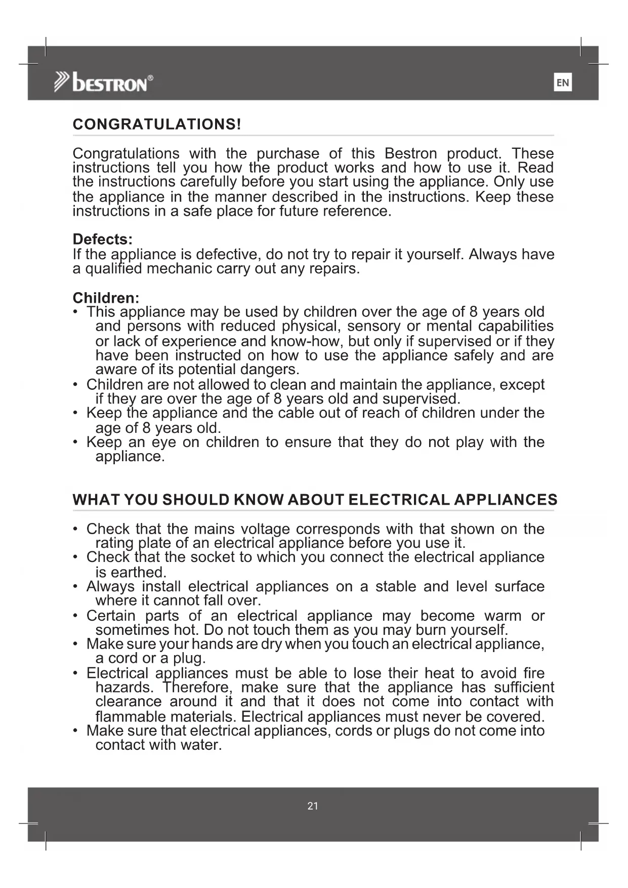 CONGRATULATIONS! Congratulations with the purchase of this Bestron product. These instructions tell you how the product works and how to use it. Read the instructions carefully before you start using the appliance. Only use the appliance in the manner described in the instructions. Keep these instructions in a safe place for future reference. Defects: If the appliance is defective, do not try to repair it yourself. Always have a qualified mechanic carry out any repairs. Children: