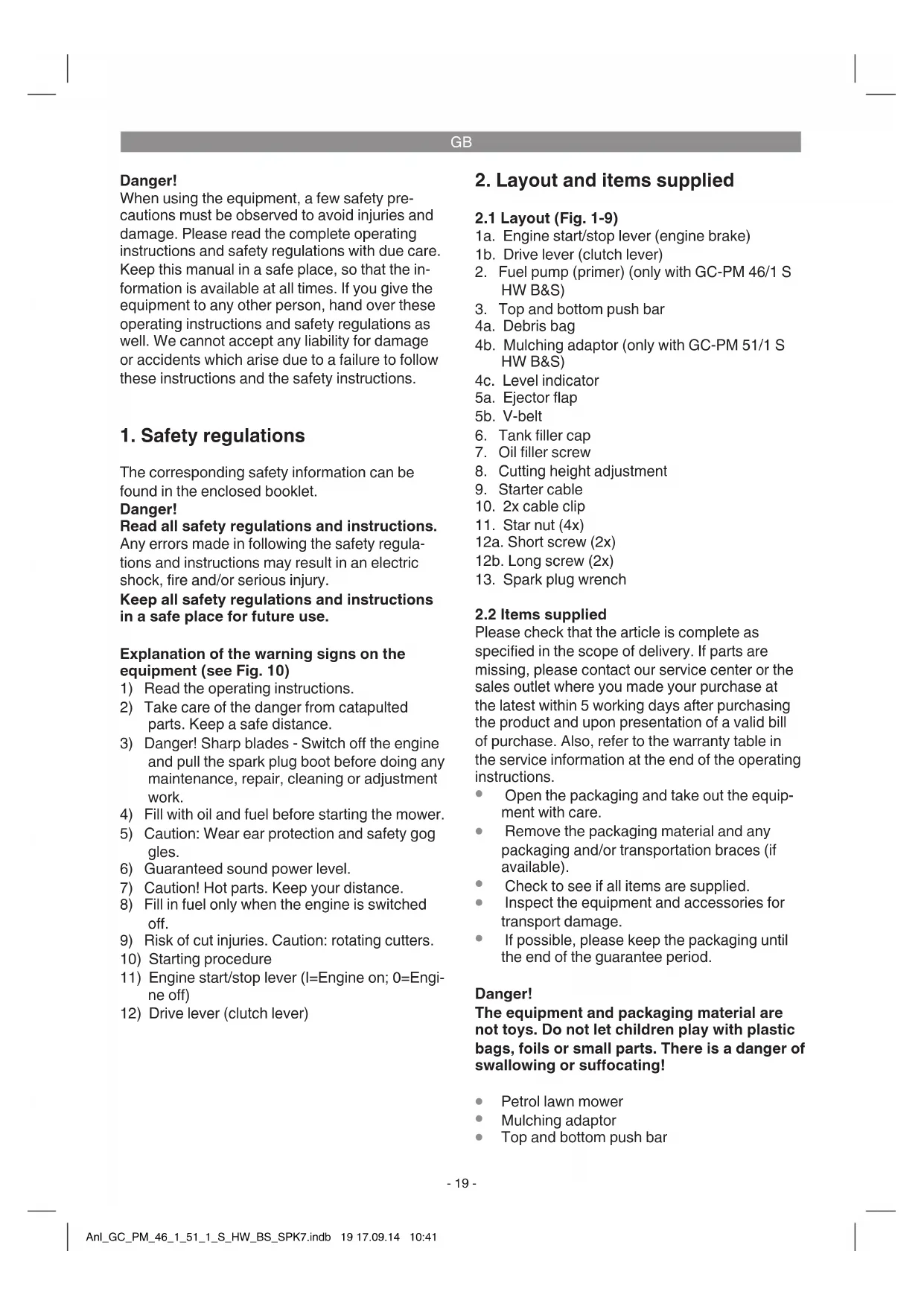 ber that the exhaust and other parts will get hot. Do not touch these parts as they may burn you. Important. If problems arise in connection with the engine, please refer to the enclosed manual from Briggs & Stratton. Fault Possible cause Remedy The equipment does not operate smoothly and vibra- tes intensively - Bolts loose - Blade attachment is loose - Blade imbalanced - Check bolts - Check blade attachment - Replace blade The engine does not start - Engine start/stop lever is not pressed - Throttle lever in wrong position (if provided) - Spark plug defective - Fuel tank empty - Fuel pump (primer) not actuated (if provided) - Press the engine start/stop lever - Check setting (if provided) - Replace spark plug - Top up fuel - Actuate the fuel pump (primer) (if provided) Engine does not run smoothly - Air lter dirty - Spark plug dirty - Clean the air lter - Clean the spark plug Lawn turns yellow, uneven cut - Blade is not sharp - Cutting height too small - Engine speed too low - Sharpen blade - Adjust to the proper height - Set the throttle lever to max. (if pro- vided) Grass chute is not clean - Engine speed too low - Cutting height too small - Blade is worn - Grass bag is clogged - Set the throttle lever to max. - Set properly - Replace the blade - Empty the grass bag The reprinting or reproduction by any other means, in whole or in part, of documentation and papers accompanying products is permitted only with the express consent of the iSC GmbH. Subject to technical changes Anl_GC_PM_46_1_51_1_S_HW_BS_SPK7.indb 26 17.09.14 10:41GB