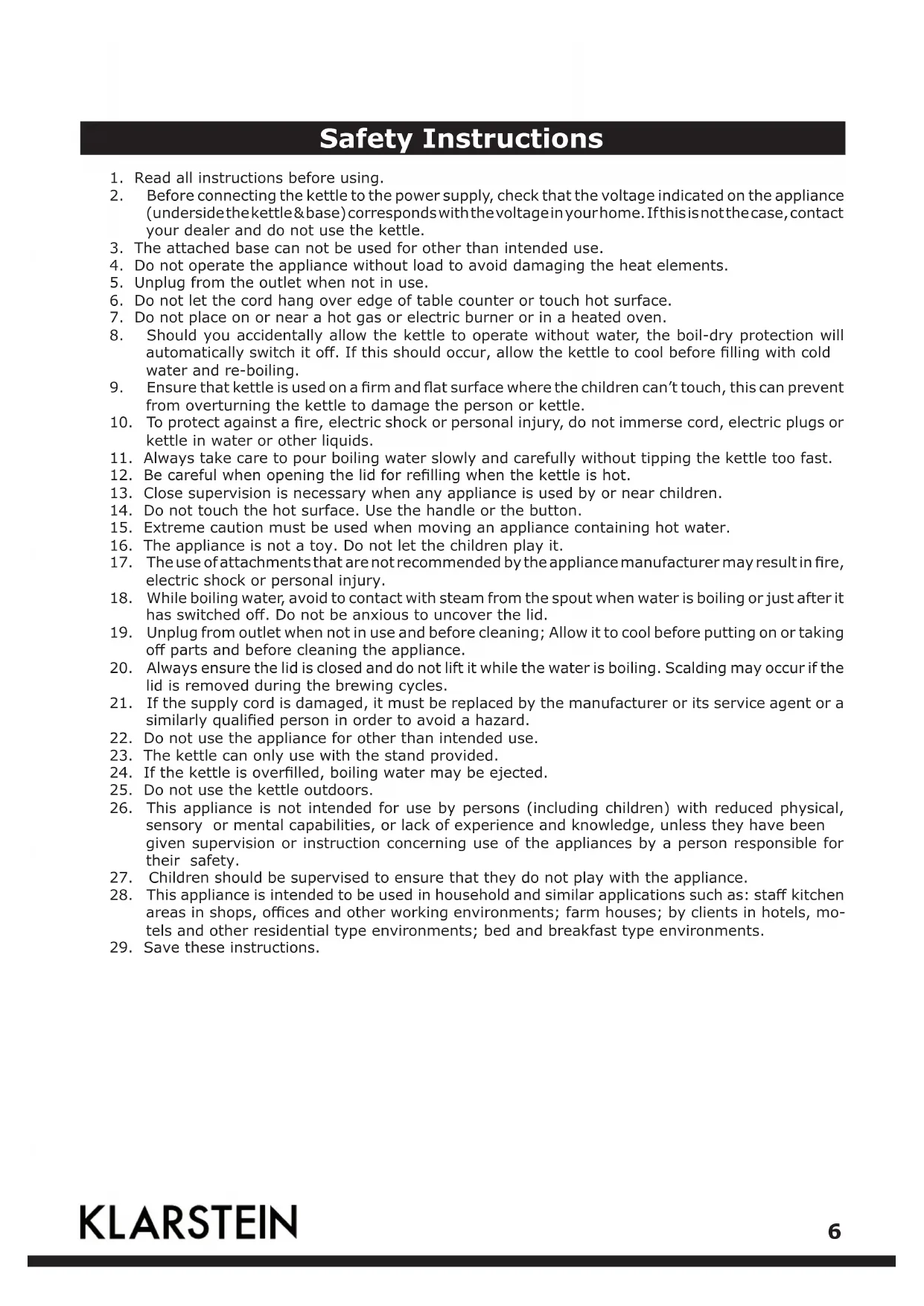 Download the instructions for your Kettle in PDF format for free! Find your manual 10021360 - Klarstein and take your electronic device back in hand. On this page are published all the documents necessary for the use of your device. 10021360 by Klarstein.