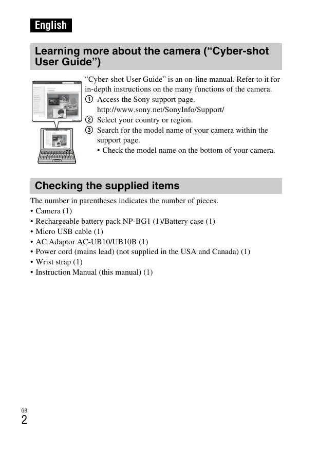 English Learning more about the camera (“Cyber-shot User Guide”) “Cyber-shot User Guide” is an on-line manual. Refer to it for in-depth instructions on the many functions of the camera. 1 Access the Sony support page. http://www.sony.net/SonyInfo/Support/ 2 Select your country or region. 3 Search for the model name of your camera within the support page.