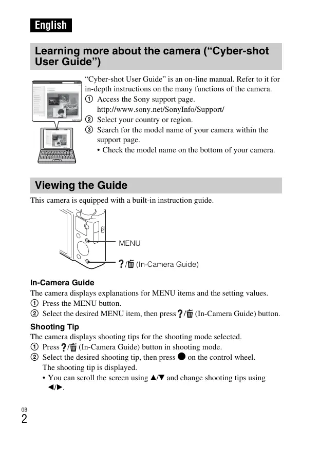English Learning more about the camera (“Cyber-shot User Guide”) “Cyber-shot User Guide” is an on-line manual. Refer to it for in-depth instructions on the many functions of the camera. 1 Access the Sony support page. http://www.sony.net/SonyInfo/Support/ 2 Select your country or region. 3 Search for the model name of your camera within the support page.