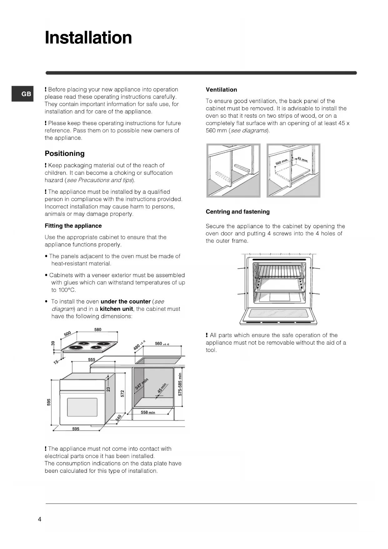 - To install the oven under the counter (see diagram) and in a kitchen unit, the cabinet must have the following dimensions: ! The appliance must not come into contact with electrical parts once it has been installed. The consumption indications on the data plate have been calculated for this type of installation. Ventilation To ensure good ventilation, the back panel of the cabinet must be removed. It is advisable to install the oven so that it rests on two strips of wood, or on a completely flat surface with an opening of at least 45 x 560 mm (see diagrams). Centring and fastening Secure the appliance to the cabinet by opening the oven door and putting 4 screws into the 4 holes of the outer frame. ! All parts which ensure the safe operation of the appliance must not be removable without the aid of a tool.