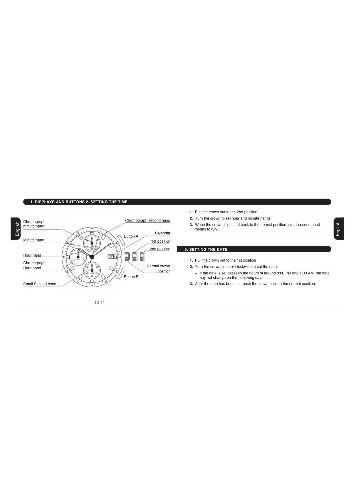 Chronograph second hand Calendar 1st position Button A Button B 2nd position Normal crown position Chronograph minute hand Minute hand Hour hand Chronograph Hour hand Small Second hand