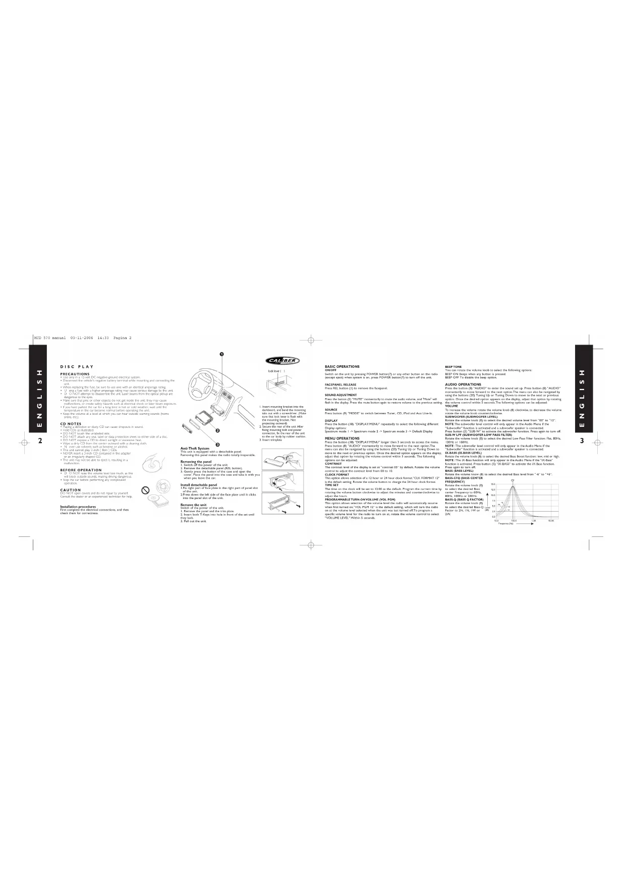 BASIC OPERATIONS ON/OFF Switch on the unit by pressing POWER button(7) or any other button on the radio (except eject) when system is on, press POWER button(7) to turn off the unit. FACEPANEL RELEASE Press REL button (1) to remove the facepanel. SOUND ADJUSTMENT Press the button (2) “MUTE” momentarily to mute the audio volume, and "Mute" will flash in the display. Press the mute button again to restore volume to the previous setting. SOURCE Press button (9) “MODE“ to switch between Tuner, CD, iPod and Aux Line-In. DISPLAY Press the button (18) “DISPLAY/MENU” repeatedly to select the following different Display options: Spectrum mode 1 -> Spectrum mode 2 -> Spectrum mode 3 -> Default Display MENU OPERATIONS Press the button (18) “DISPLAY/MENU” longer then 3 seconds to access the menu. Press button (8) “AUDIO” momentarily to move forward to the next option.The menu can also be navigated by using the buttons (20) Tuning Up or Tuning Down to move to the next or previous option. Once the desired option appears on the display, adjust that option by rotating the volume control within 5 seconds. The following options can be adjusted: CONTRAST The contrast level of the display is set at “contrast 05” by default. Rotate the volume control to adjust the contrast level from 00 to 10. CLOCK FORMAT This option allows selection of a 12 hour or 24 hour clock format.“CLK FORMAT 12” is the default setting. Rotate the volume button to change the 24 hour clock format. TIME SET The time on the clock will be set to 12:00 as the default. Program the current time by rotating the volume button clockwise to adjust the minutes and counterclockwise to adjust the hours. PROGRAMMABLE TURN-ON VOLUME (VOL PGM) This option allows selection of the volume level the radio will automatically assume when first turned on.“VOL PGM 12” is the default setting, which will turn the radio on at the volume level selected when the unit was last turned off.To program a specific volume level for the radio to turn on at, rotate the volume control to select “VOLUME LEVEL”.Within 5 seconds. BEEP TONE You can rotate the volume knob to select the following options: BEEP ON Beeps when any button is pressed. BEEP OFF To disable the beep option. AUDIO OPERATIONS Press the button (8) “AUDIO” to enter the sound set up. Press button (8) “AUDIO” momentarily to move forward to the next option.The menu can also be navigated by using the buttons (20) Tuning Up or Tuning Down to move to the next or previous option. Once the desired option appears on the display, adjust that option by rotating the volume control within 5 seconds.The following options can be adjusted: VOLUME To increase the volume rotate the volume knob (8) clockwise, to decrease the volume rotate the volume knob counterclockwise. SUBWOOFER (SUBWOOFER LEVEL) Rotate the volume knob (8) to select the desired volume level from “00” to “12”. NOTE:The subwoofer level control will only appear in the Audio Menu if the “Subwoofer” function is activated and a subwoofer speaker is connected. Press button (3) “SUB-W” to activate the subwoofer function. Press again to turn off. SUB-W LPF (SUBWOOFER LOW PASS FILTER) Rotate the volume knob (8) to select the desired Low Pass Filter function: Flat, 80Hz, 120Hz or 160Hz. NOTE :The subwoofer level control will only appear in the Audio Menu if the “Subwoofer” function is activated and a subwoofer speaker is connected. IX-BASS (IX-BASS LEVEL) Rotate the volume knob (8) to select the desired Bass Boost function: low, mid or high. NOTE :The iX-Bass function will only appear in the Audio Menu if the “iX-Bass” function is activated. Press button (5) “IX-BASS” to activate the iX-Bass function. Press again to turn off. BASS (BASS LEVEL) Rotate the volume know (8) to select the desired Bass level from “-6” to “+6”. BASS-CFQ (BASS CENTERFREQUENCY) Rotate the volume knob (8) to select the desired Bass center Frequency to 60Hz, 80Hz, 100Hz or 200Hz. BASS-Q (BASS Q FACTOR) Rotate the volume knob (8) to select the desired Bass-Q Factor to 2N, 1N, 1W or 2W.